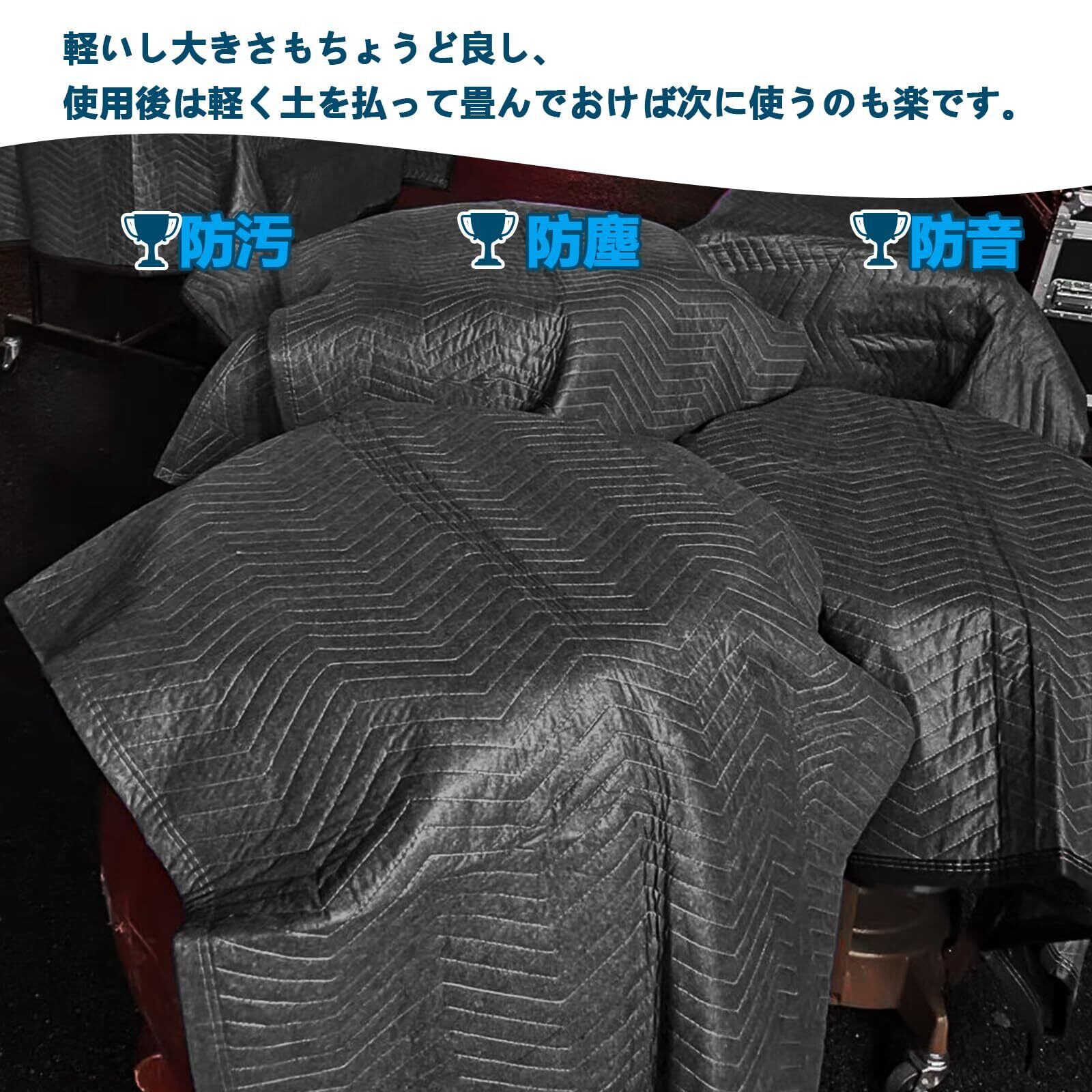 【商品仕様】養生クッションマットの素材:ポリエステル+綿。サイズ:180x120cm、重さ:0.9kg/枚、サイズと適度な厚さがあり、持ち運びも軽く、使いやすいです。【広い用途】大型ゴミを出す時とか、断捨離とかの時にまとめて荷物を出して選別する時に敷いたりとか、車の荷台の傷防止、DIY、作業、ピクニック、キャンプの敷物など、様々な養生シーンで活躍できます。