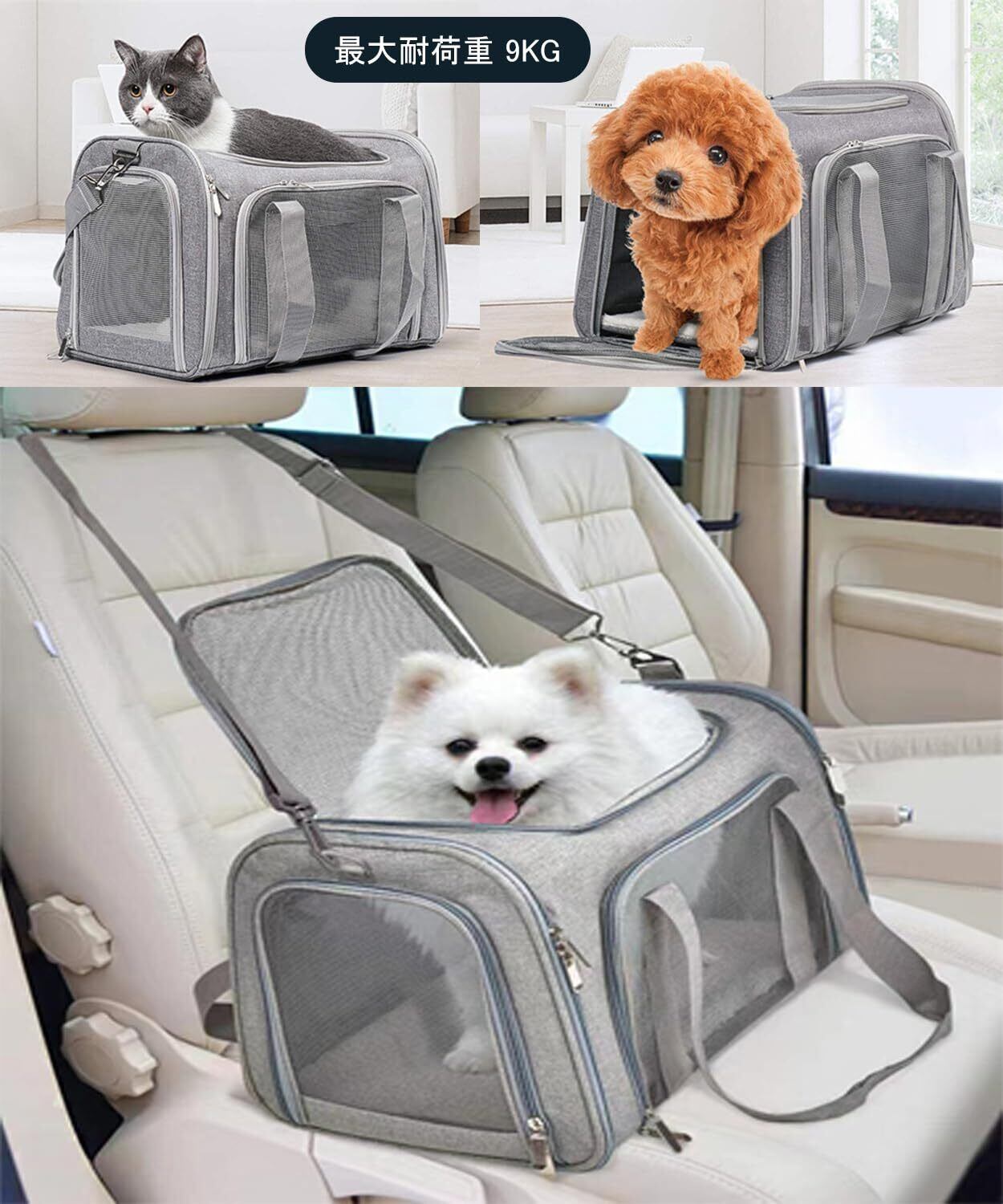 【多機能設計】猫用キャリングバッグは多様な使い方ができるように設計されています。調節可能なショルダーストラップで手提げバッグまたは肩掛けバッグに簡単に切り替えることができ、車内でもご使用いただけます。厚めの肩パッドとハンドルが肩と手の負担を効果的に軽減し、長時間の使用でも疲れにくいです。さらに、便利なポケットも付いており、携帯電話や鍵などの小物の収納に便利です。