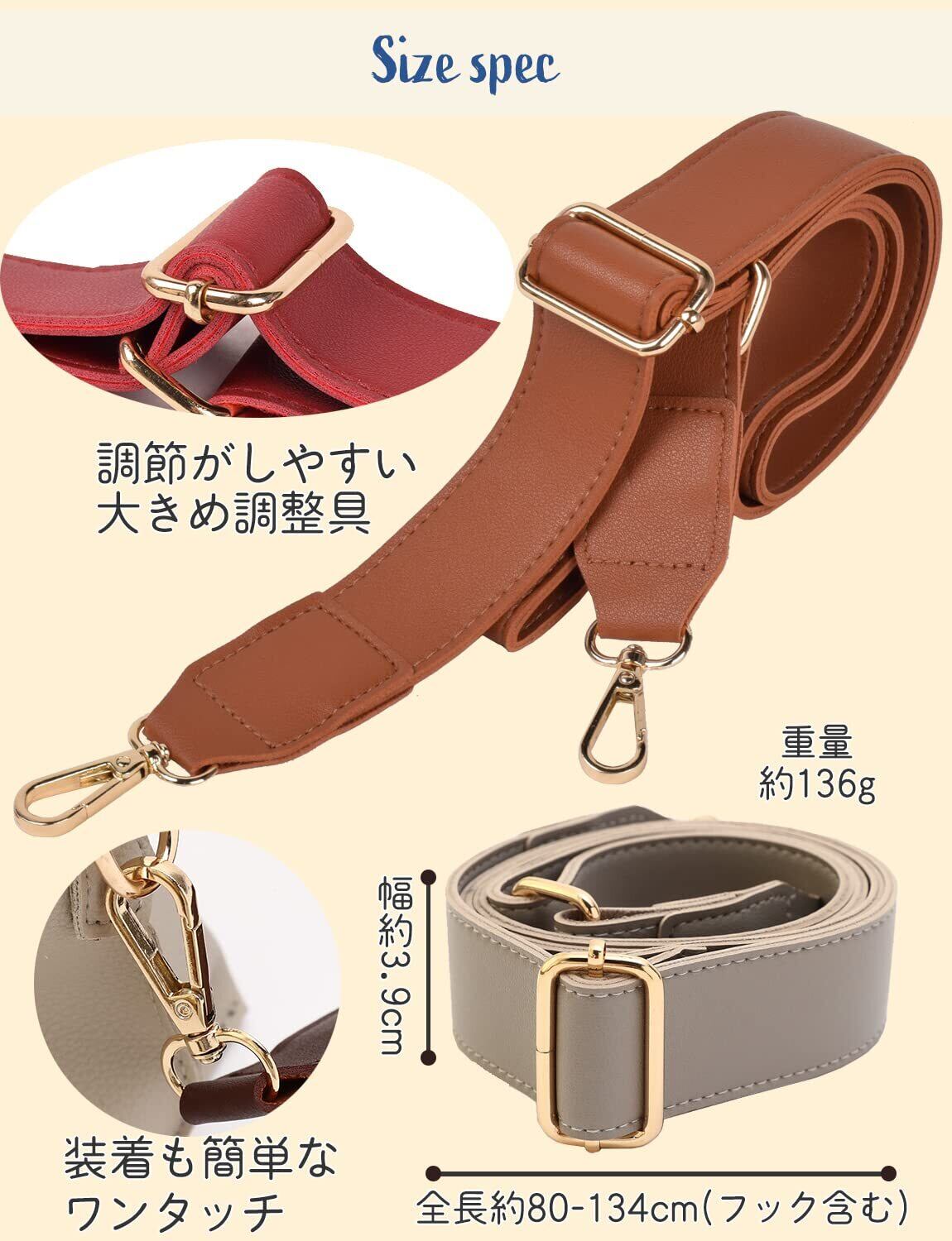 ショルダー紐長さ約80~134cm(フック含む)、ベルト幅約3.9cm、厚み約4mm、重さ約136g、合成皮革素材