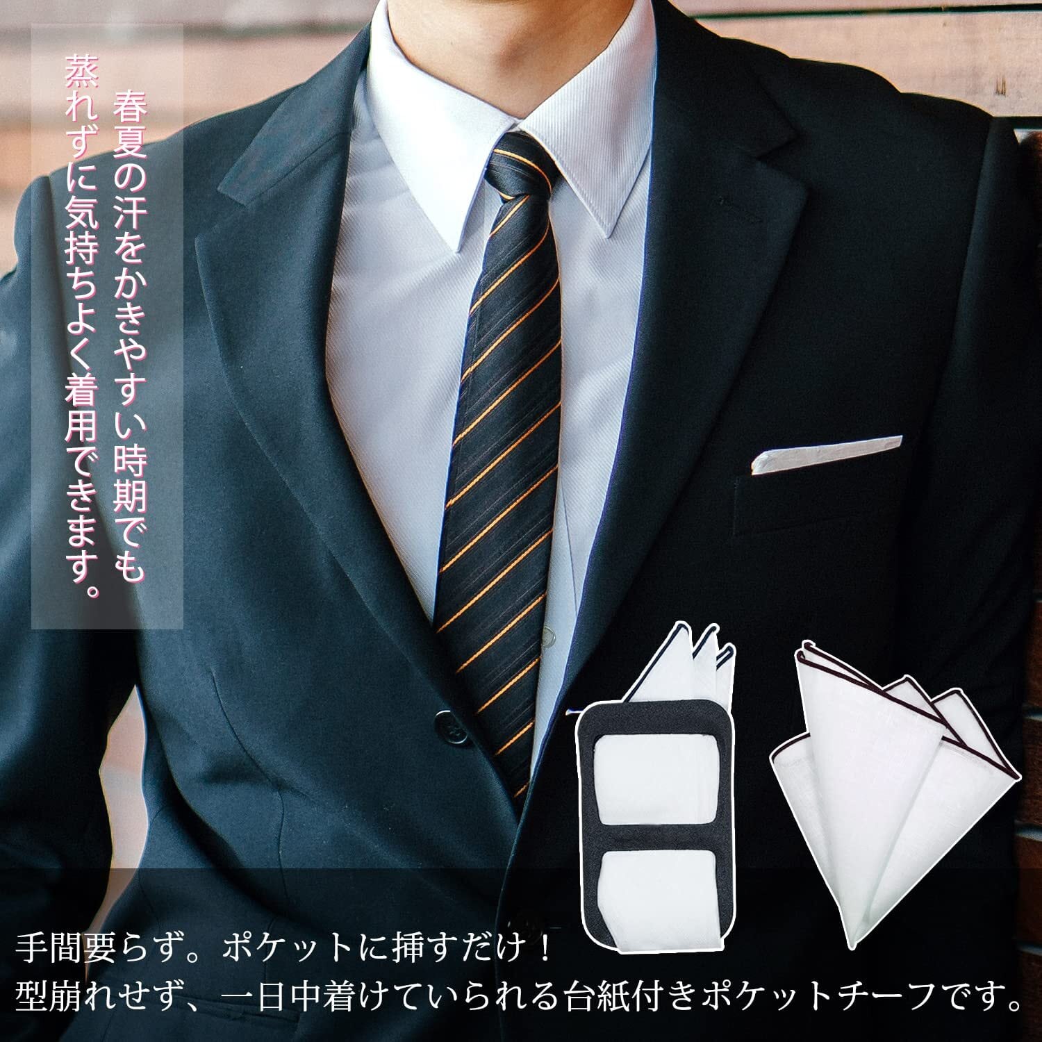 【ポケットチーフの型崩れを完全防止!! 】ポケットチーフの型崩れを防止するホルダーが付き。ポケットチーフを穴に通してポケットに挿すだけで 型崩れ・沈み込みを完全防止。ポケットチーフを気にする面倒から解放され ビジネス・イベントに集中できます!!