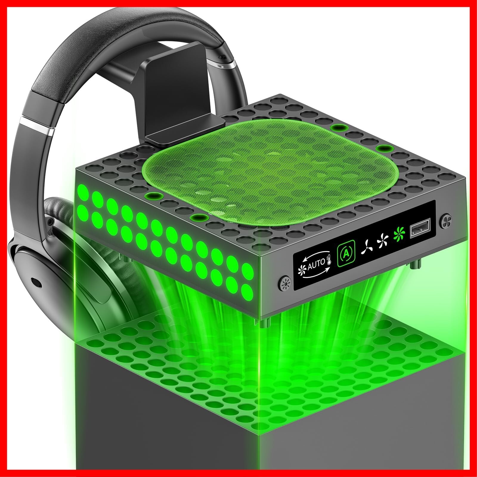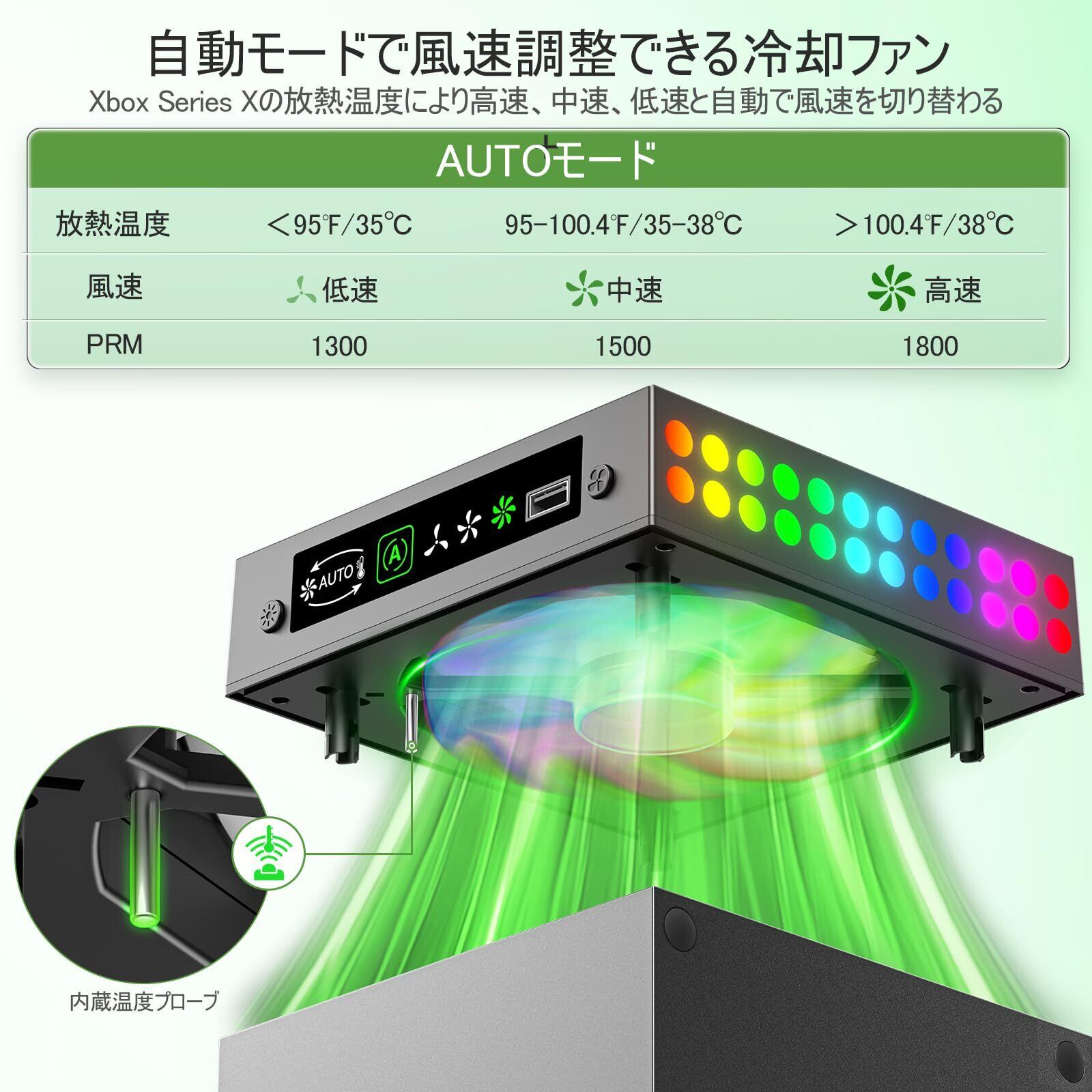 X-box Series X冷却ファン クーリングファン 低騒音 知的温度制御 手動/AUTOモード 3段階速度調整 取り付け簡単 熱対策 排熱 防塵 取り外し可能なヘッドセットフック付き RGB LED雰囲気ライト付 XboxシリーズX コンソール用アクセサリー Xbox Series Xに対応 周辺機器