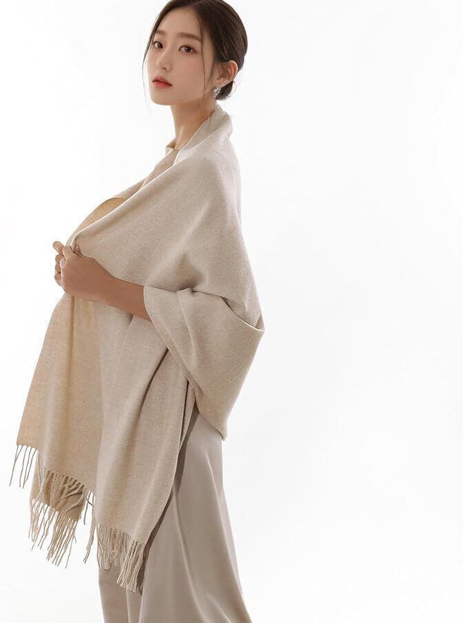 巻アレンジはもちろん、羽織りにも膝掛けにも使える。カシミヤタッチなので、ウールが苦手な方にもオススメ