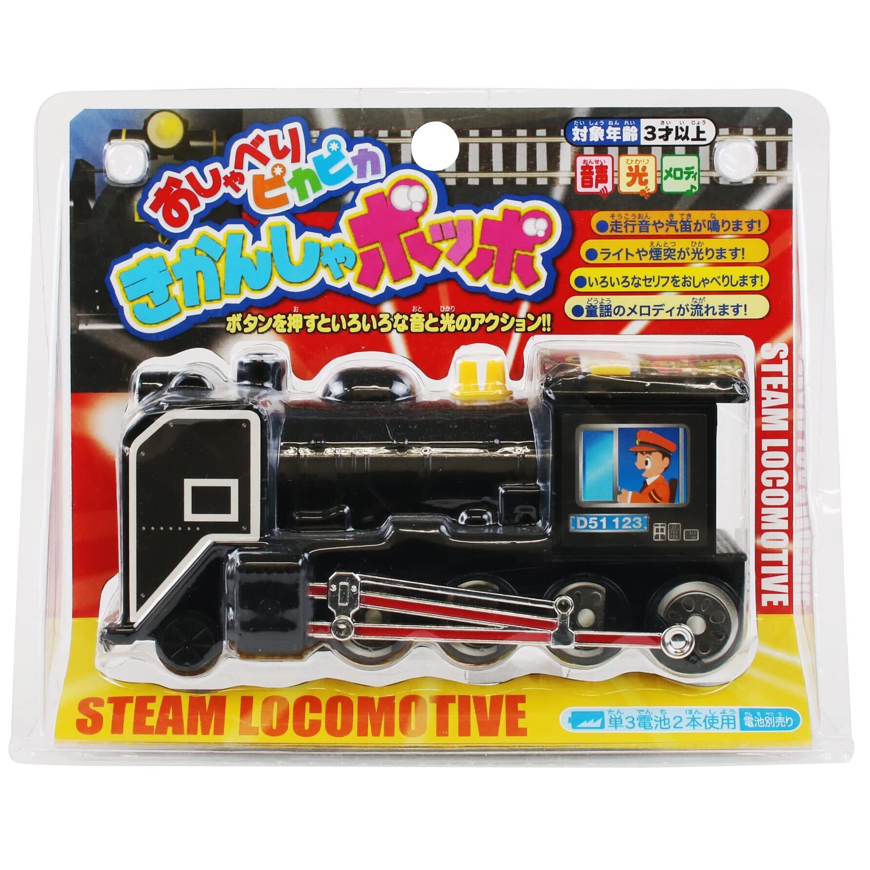 ボタンを押すとピカピカ光って、走行音・汽笛・おしゃべり3種・メロディ4曲が流れます。