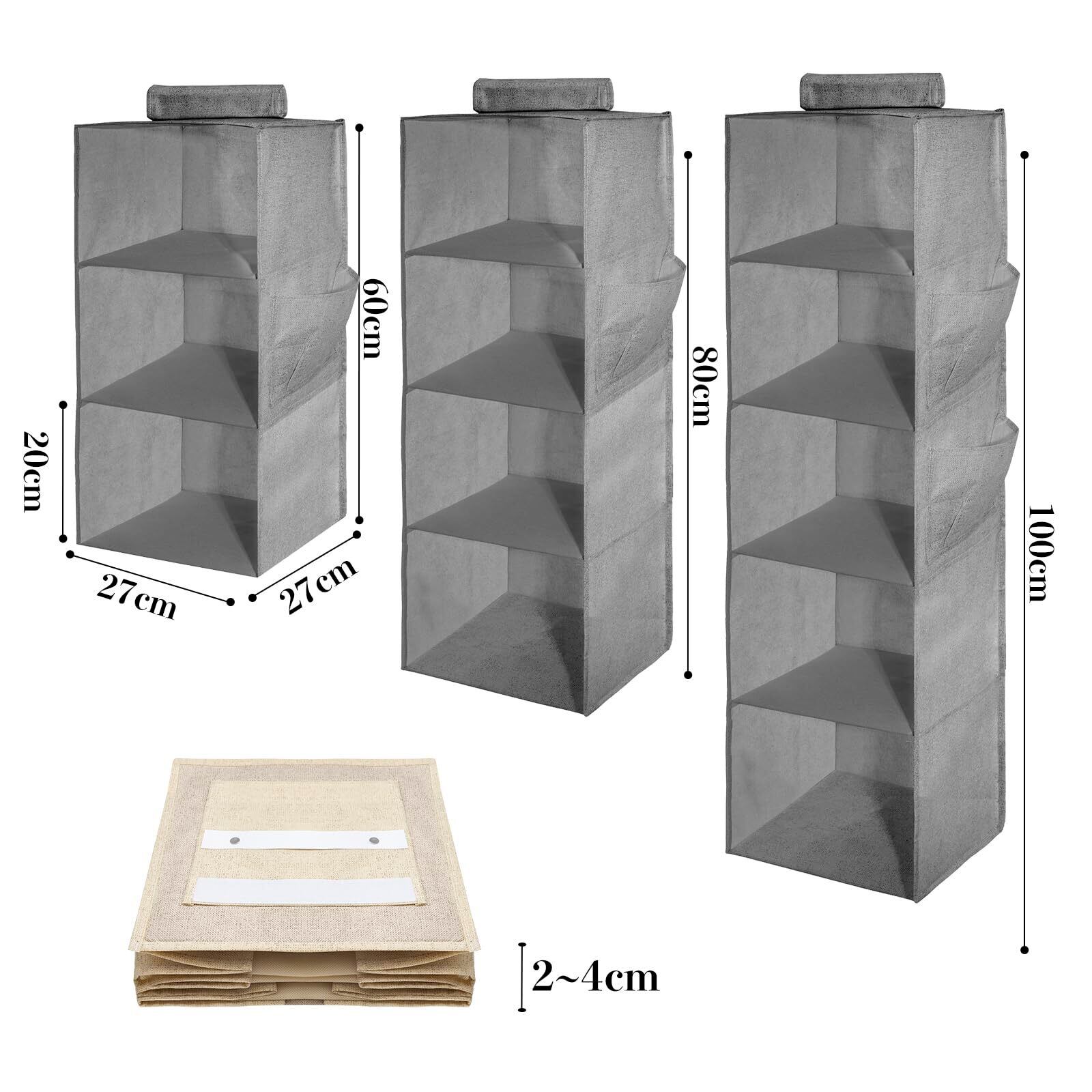 吊り下げ収納 【最新強化版】 クローゼット 収納吊り下げ 4段 PPボード 大容量 衣類ラック 帽子/鞄 収納/旅行/出張 取付簡単 折り畳み式(グレー、27x27x80cm)