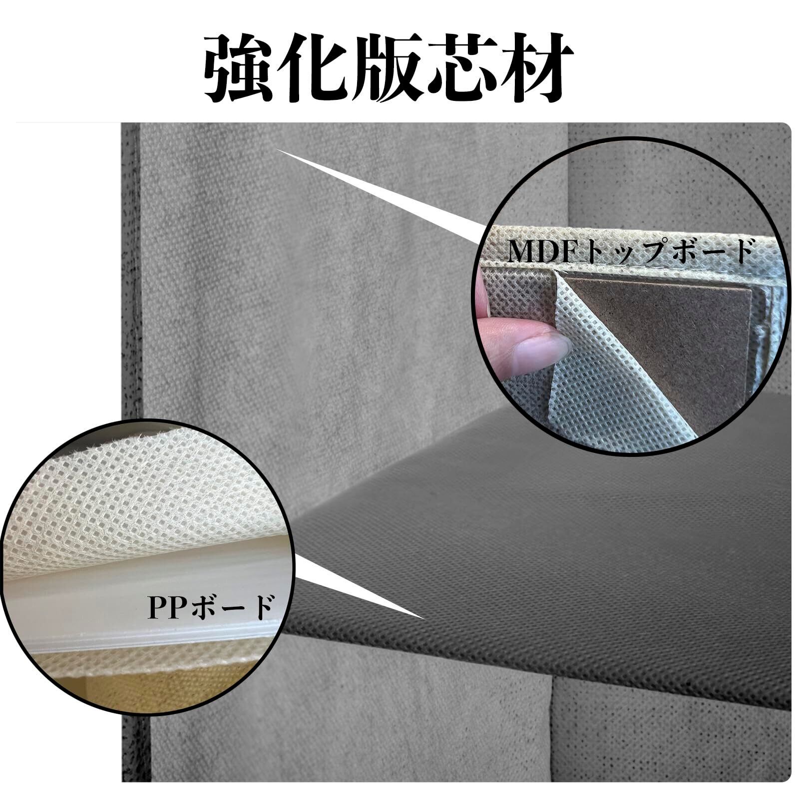 【強化版芯材】MDFトップボード入りなので、耐荷重も強いし、耐久力も強い。仕切り板にPPボードを採用し変形しないようになっている。