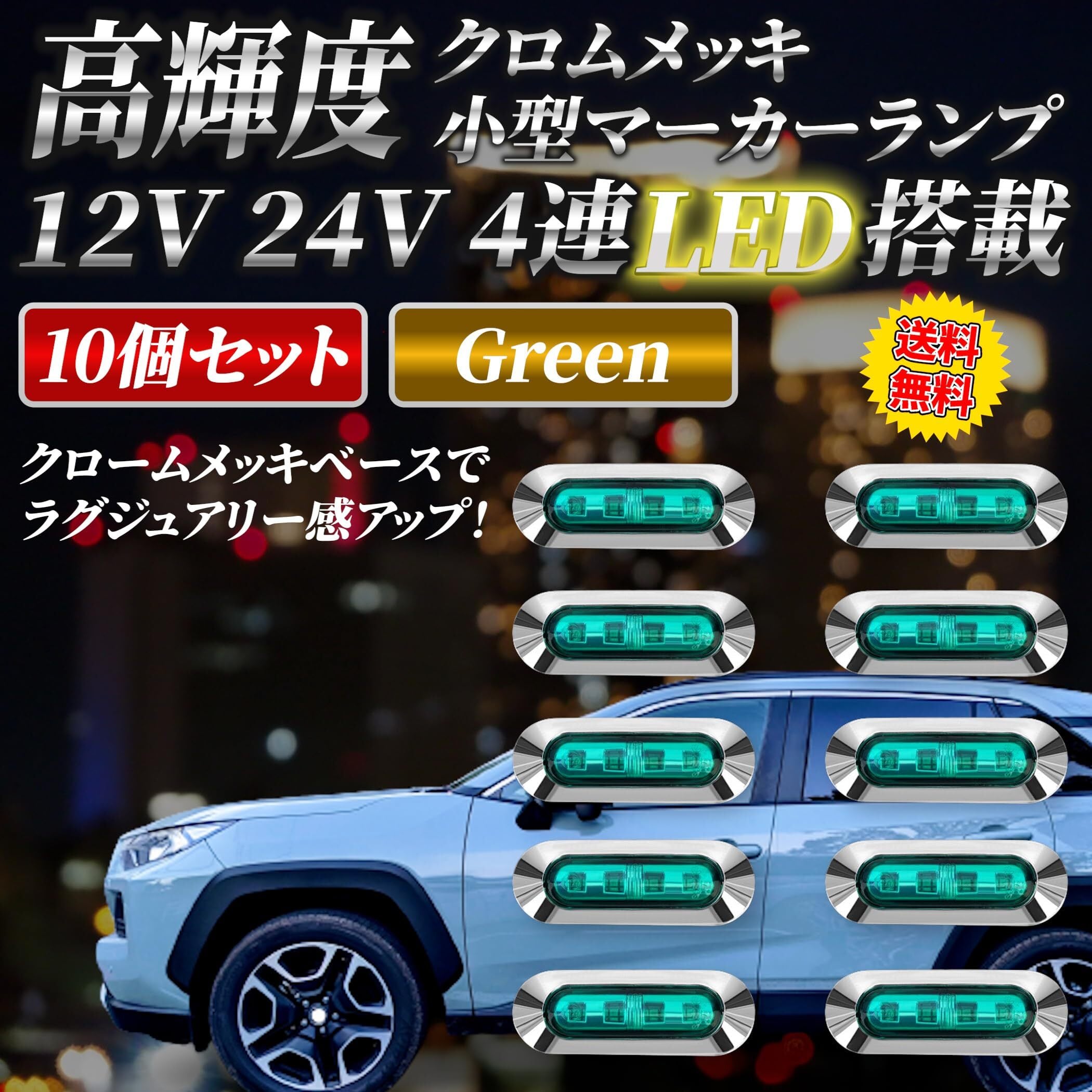 LED 4連 カラーレンズ 10個セット 12V 24V 高輝度 小型 ランプ サイド マーカー 防水型 トラック メッキ カスタム (グリーン)