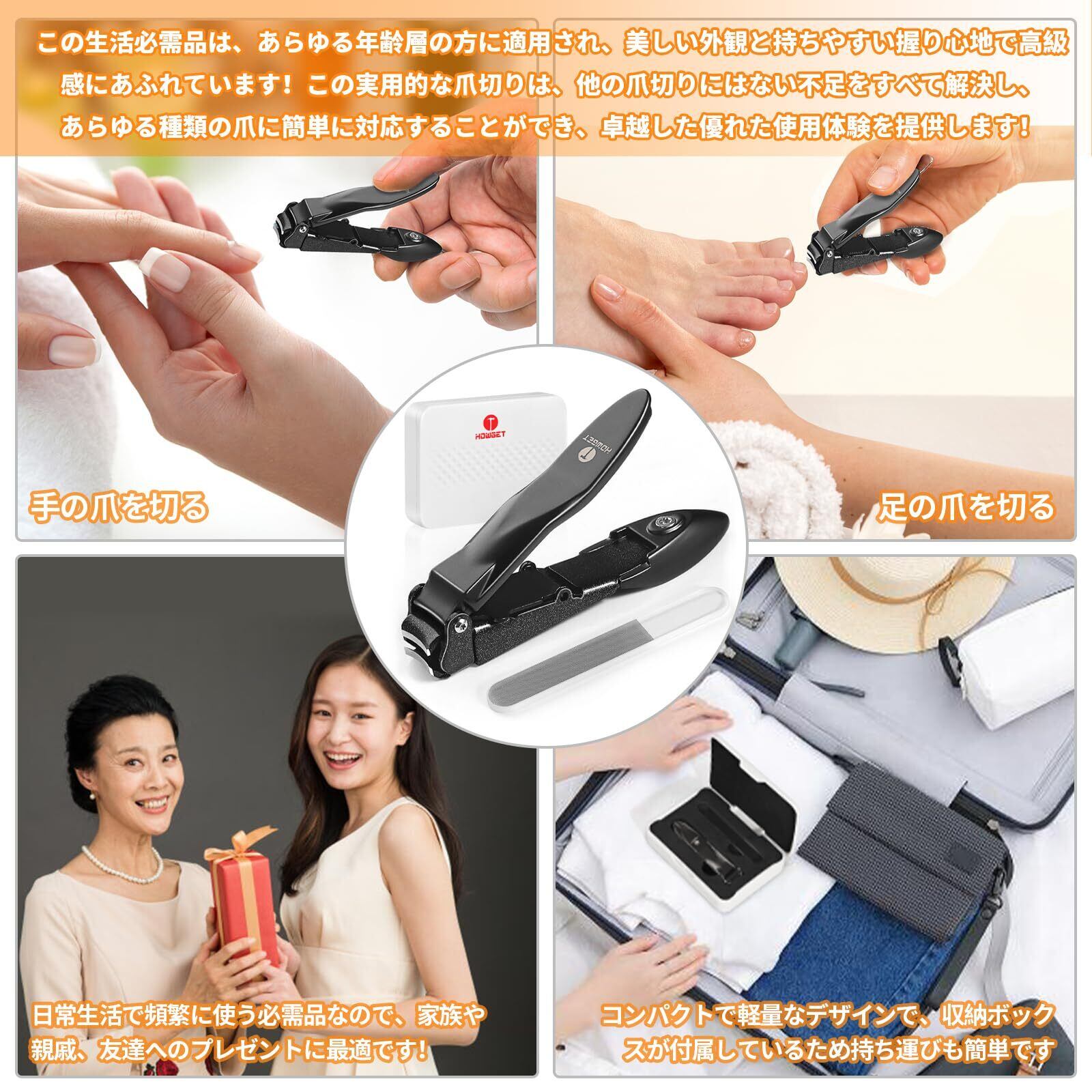 散乱防止:HOWGET シリーズの爪切りは、内蔵の爪かす収納ボックス設計により、爪を切る際に爪かすが自動的に収納され、使用環境を清潔に保ちます。いつでもどこでも優雅に爪を切ることができ、爪を切ることがより楽しくなります。