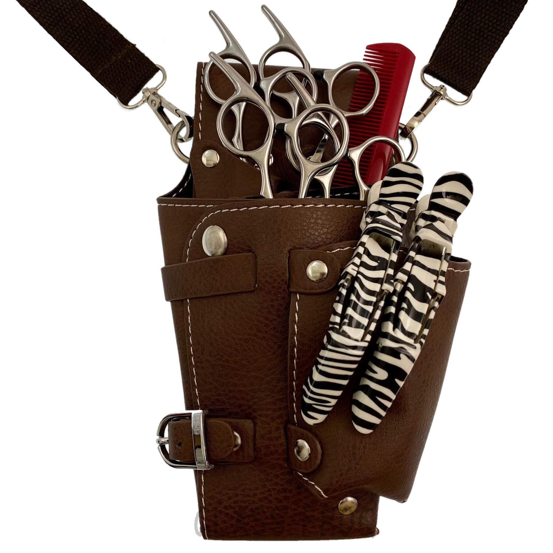 【サイズ】本体 最大幅14cm・高さ22.3cm/ベルト 最短72cm~最長130cm 【重量】本体約200g(*色によって多少の誤差は有ります) 【素材】本体 PUレザー/ベルト 布 【仕様】シザー5丁収納/多目的スペース×2/見開き可能
