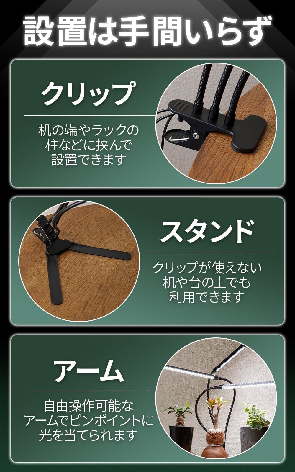 【小型・中型の植物育成に最適】机の端や机上に設置できる、小型・中型の観葉植物に最適な3灯の植物育成ライトです。