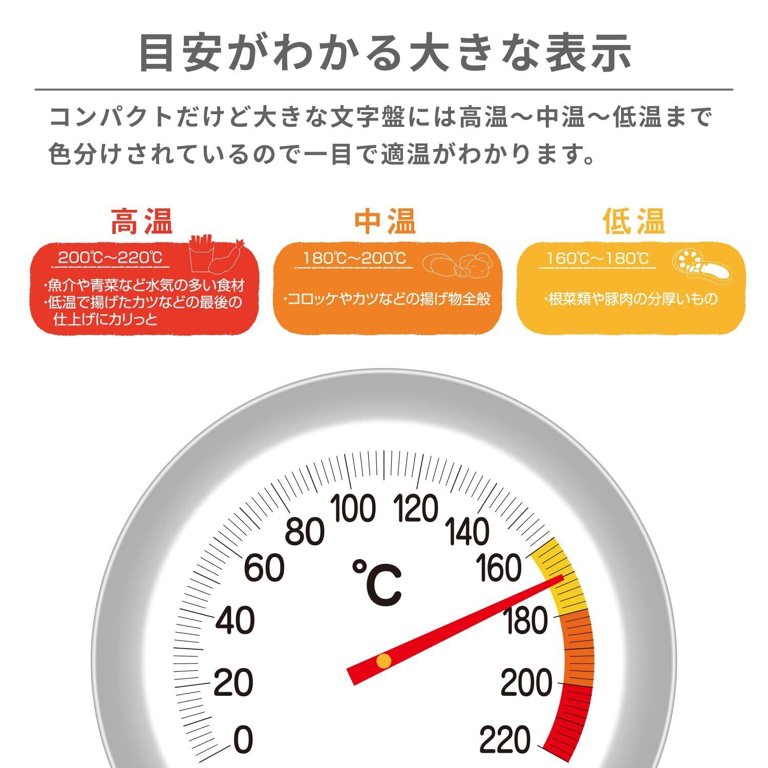 0℃~220℃まで測定できます。 コンパクトサイズですが、大きな文字盤には低温中温高温が色でわかりやすく表示されています。 食材や調理によって適切な温度帯があり、美味しく仕上げるには重要になります。