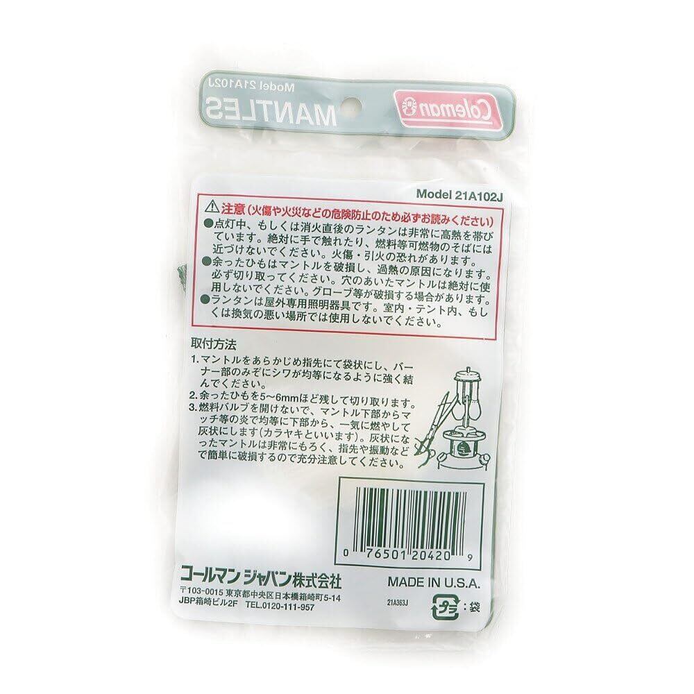 Coleman(コールマン) ■21A型マントル ■2枚入 ※予告なしでパッケージなどのデザインや商品のカラー等が変更になる場合があります。 ※商品画像のカラーにつきましては、ご利用のパソコン等環境によって実物と多少異なる場合がありますので、あらかじめご了承ください。