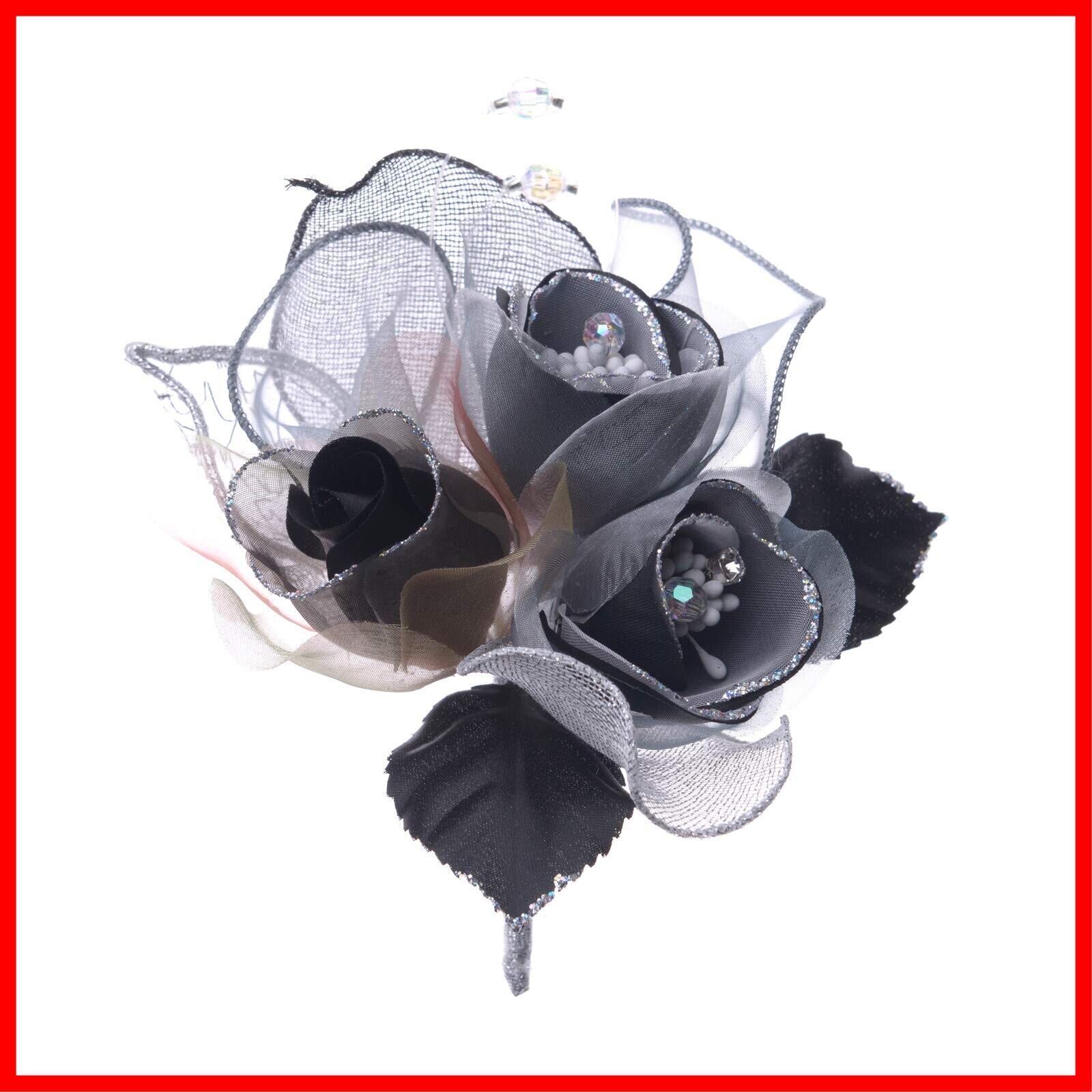2つのお花に1つのつぼみ。お花の花弁にはストーンとクリスタルビーズが輝いています。サテン、オーガンジー、メッシュの異素材の組み合わせで質感も高く、ジャケットやドレスを引き立ててくれます。横から見たときの立体感にも注目です。