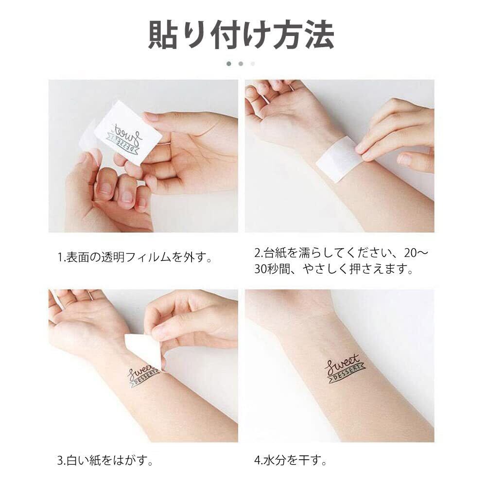 1.貼り付けたい絵柄を切り取り、表面の透明フィルムを外す。2.水を含んたタオルやスポンジをシールの上に置く、台紙を濡らしてください、20~30秒を待つ。3.通常は5-7日程度保つ事が出来ます。腕、足、体、胸、肩、背中など、お好きな場所に簡単貼る。