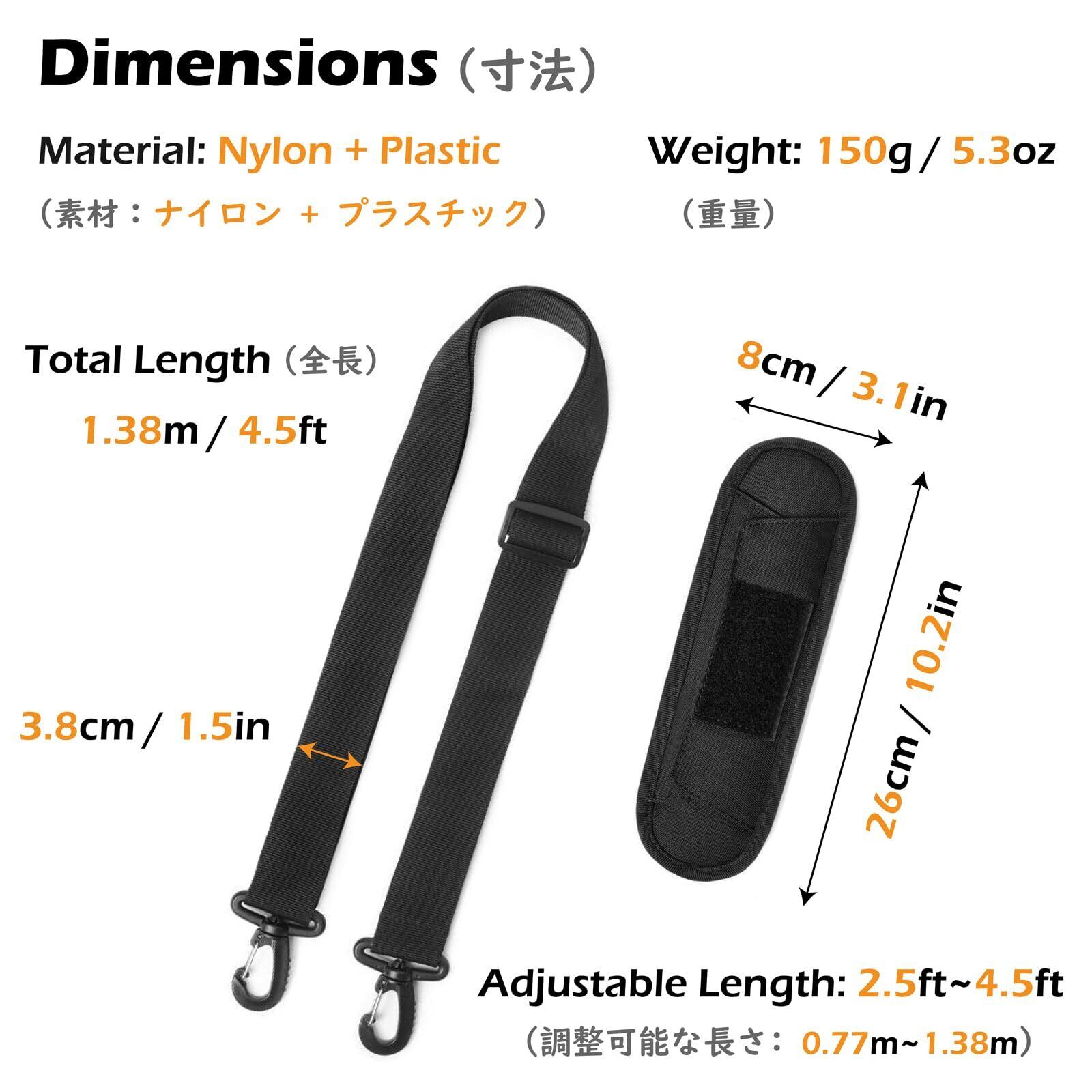 【特徴】柔らかく通気性があるパッドは取り外し可能。ハンドバッグ、荷物用コンピュータバッグ、ダッフルバッグ、ラップトップブリーフケース、ブリーフケース、アウトドアスポーツバッグ、旅行バッグ、メッセンジャーバッグ、その他のショルダーバッグ用の調整可能な交換用ベルト