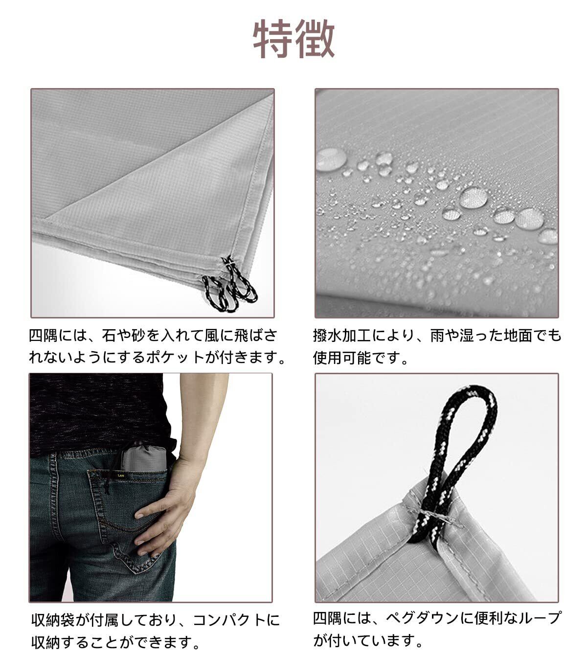 【使い勝手抜群】四隅にはペグダウンに便利なループ、風飛びを防止できるポケットが付いています。