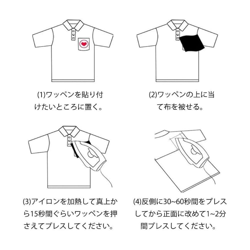 【使用方法】(1)ワッペンを貼り付けたいところに置く。(2)ワッペンの上に当て布を被せる。(3)アイロンを加熱して真上から15秒間ぐらいワッペンを押さえてプレスしてください。(4)反側に30~60秒間をプレスしてから正面に改めて1~2分間プレスしてください。