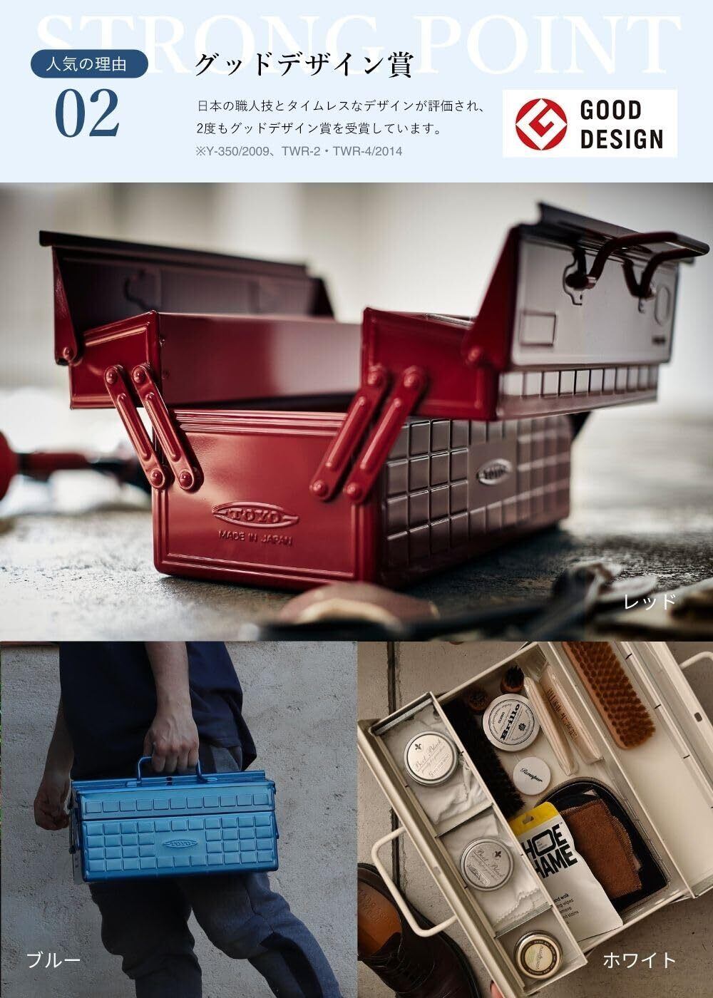 工具収納はもちろん、キャンプ・DIY・アウトドア・インテリアなど、様々な用途で使えます。 カラーバリエーション豊富で、お好きな色からお選びいただけます。