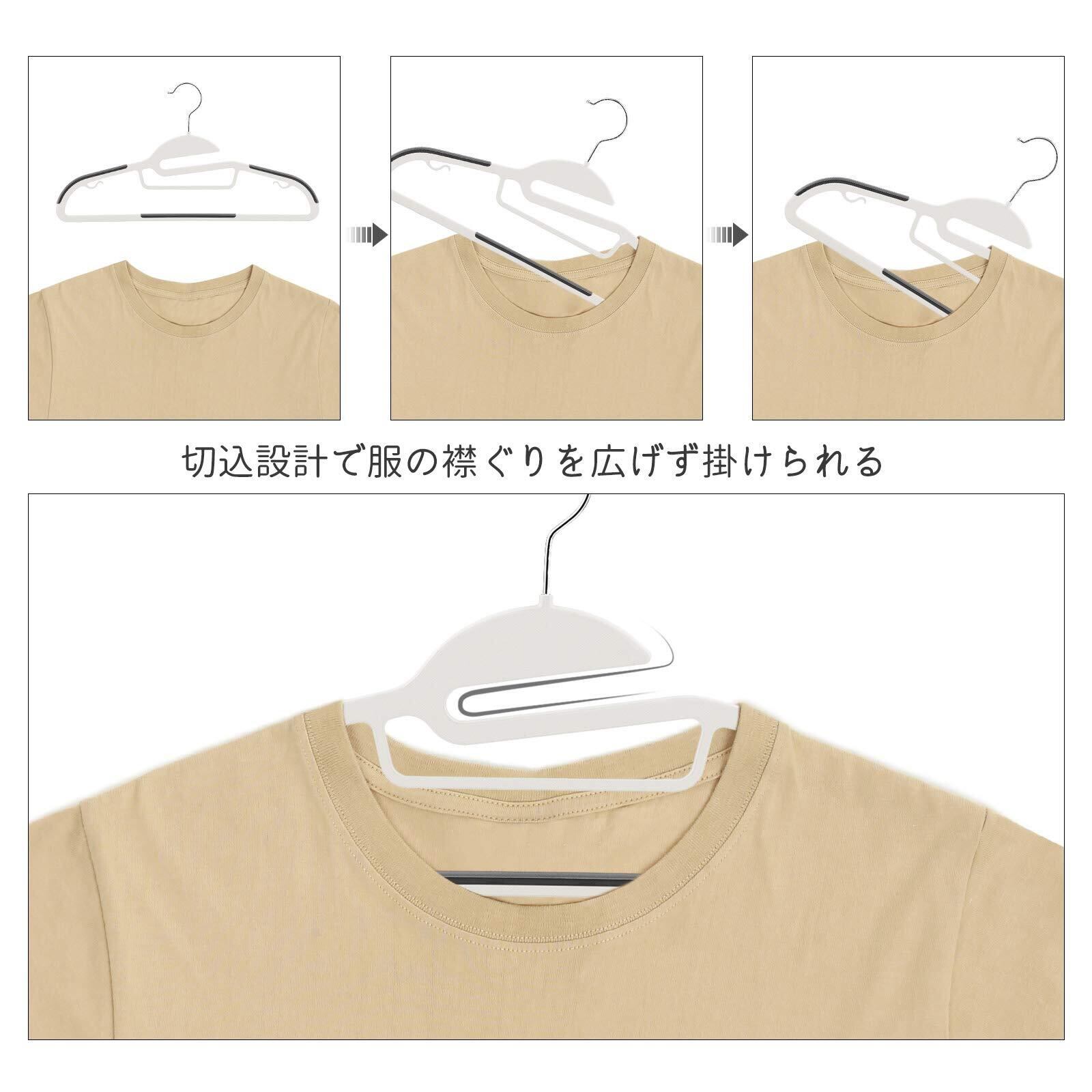 【型崩れ防止】首元の切込み設計で服の襟ぐりを広げずかけることができます。Tシャツはもちろん、ハイネックのセーターなども襟元を伸ばさずに、きちんと型をキープします