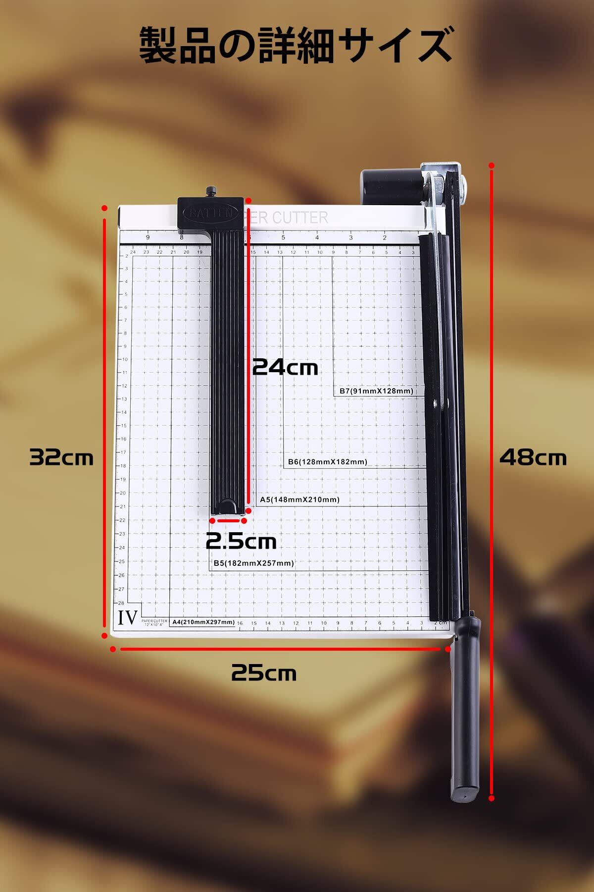 【商品仕様】 サイズ:縦32cm、横25cm、持ち手付き刃 長さ48cm 【付属品】ペーパープレス、位置決め定規 【裁断対応サイズ】B7/B6/A5/B5/A4対応 【最大カット枚数】コピー用紙12枚 【カット可能素材】紙、繊維・プラスチック製品 写真ダンボールなど.