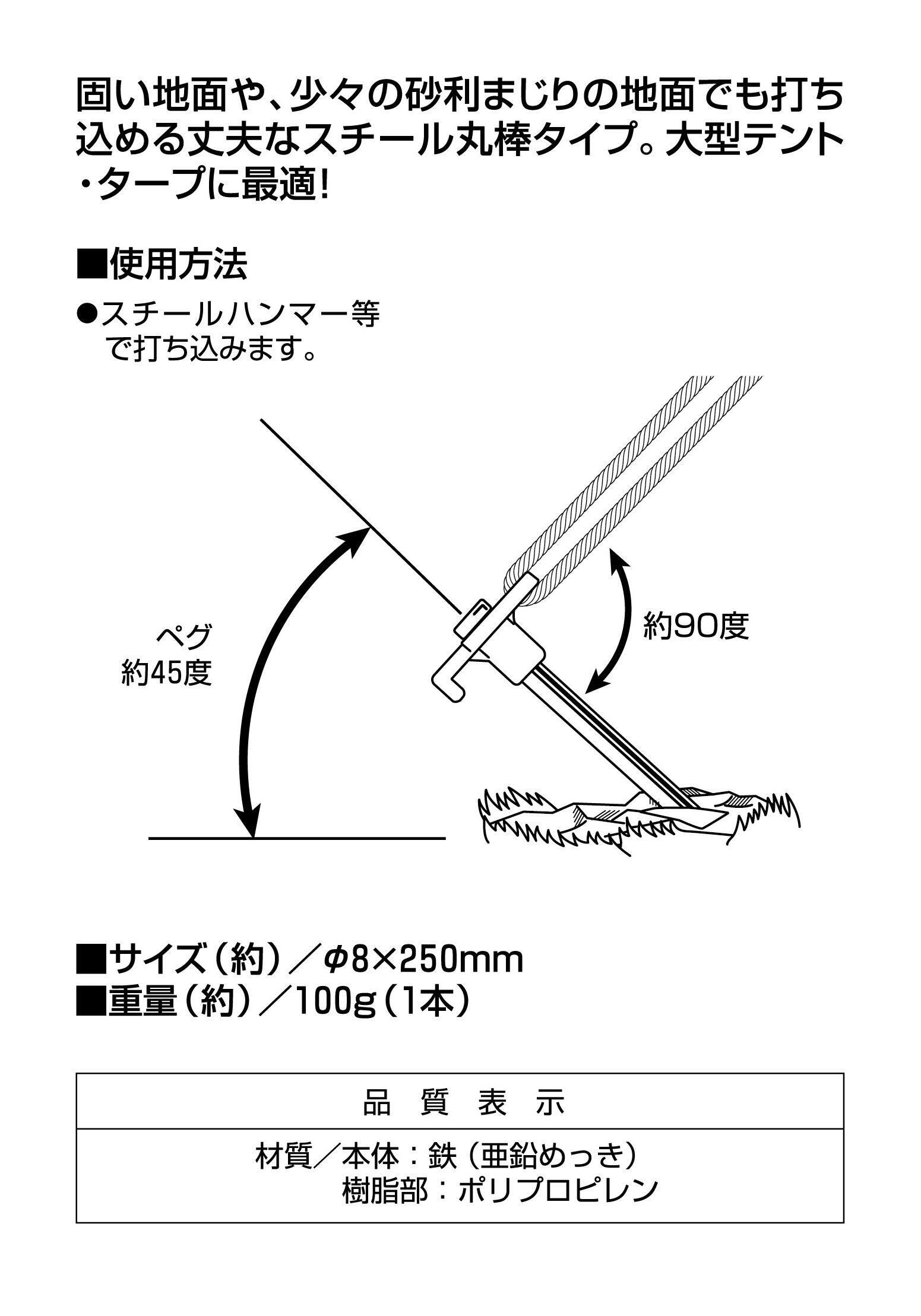 固い地面や、少々の砂利まじりの地面でも打ち込める丈夫なスチール丸棒タイプ。