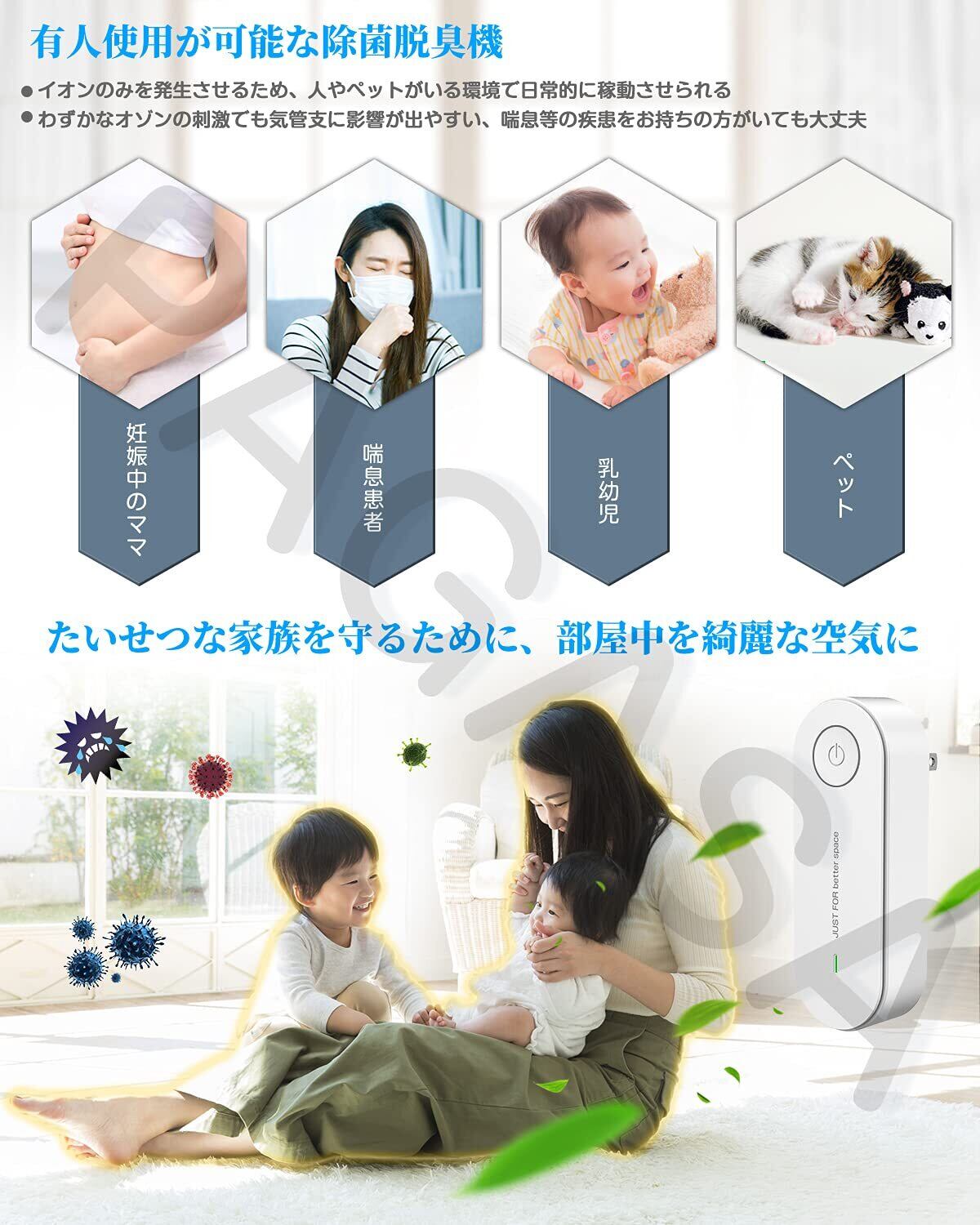 1.発注する時に必ず販売元确认:PAGASA .JAPANをご利用ください。他社の製品は品質保証できませんので、ご注意ください。高濃度でイオンを放出し、お部屋に漂う嫌なニオイの消臭やニオイの元となるニオイ原因菌まで除菌します。有人空間での使用はお勧めできないオゾン脱臭機と違い、イオンの力で安心空間を創出します。持続する確かな脱臭性能で、家の中の気になる「排せつ物臭」や「ペット臭」など多種類の頑固なニオイ脱臭します。特にペットのいるご家庭、タバコの臭い対策などにおすすめ。ご注意:短時間で強力脱臭とはいきませんが、安定した脱臭を行ってくれます。ただし、ニオイ元の近くで使用するなどの工夫が必要です。