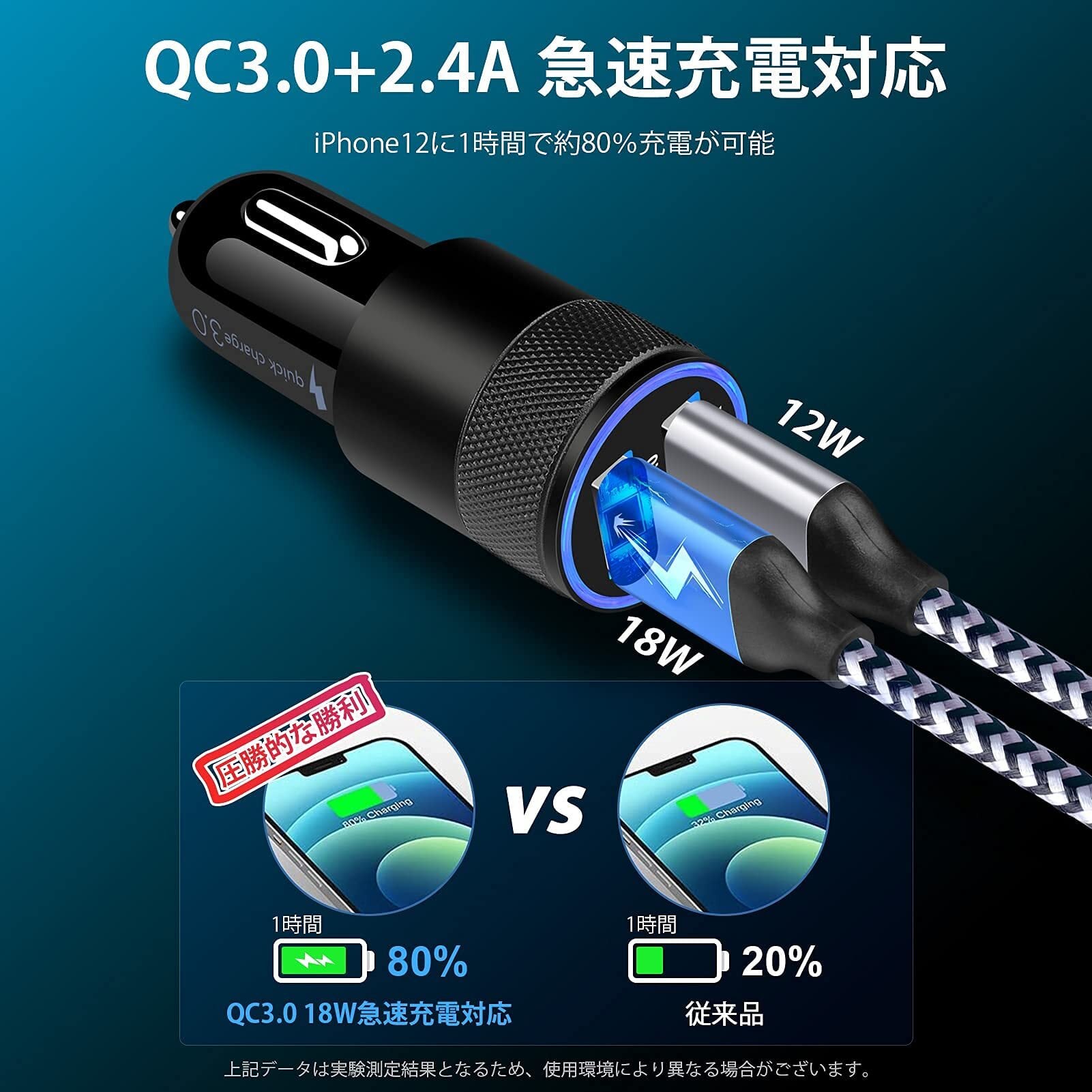 【QC3.0急速充電器】:しがーソケット usbはQuick Charge3.0対応しており、18W/3A のフルスピード充電が可能です。2.4Aのポートは最大(5V/2.4A) の電流をお送りします。2口搭载の車 usb シガーソケットなので、2台同時に充電ができます。