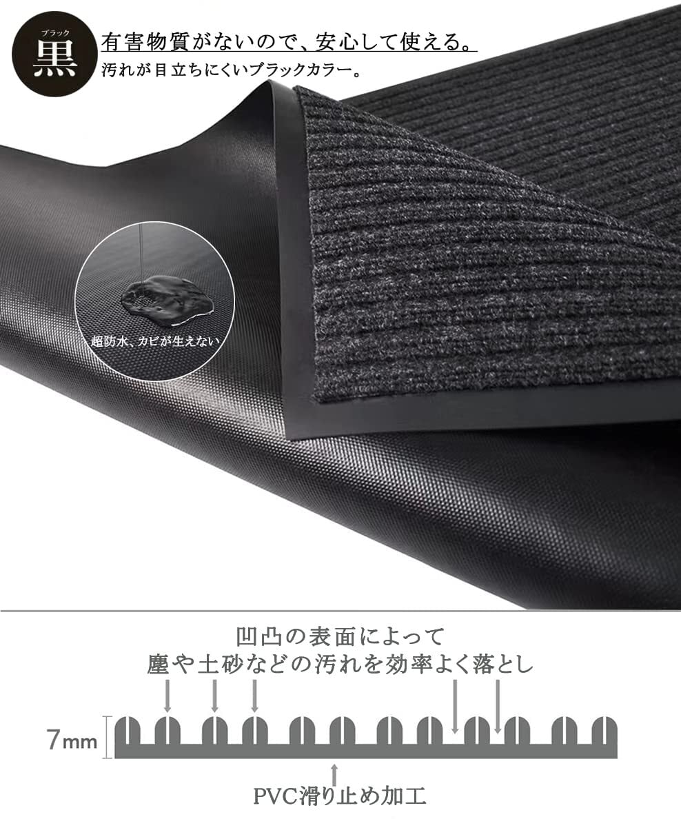 【泥落とし、吸水】屋内、屋外でお使いいただける玄関マットです。表面の凸凹が屋内に持ち込みたくないホコリ汚れや水などをしっかり捕らえ、吸収する機能的なマットです。長い梅雨の日でも大雪の日の中でもフロア汚れを最小限に抑えます!また、マットが抗菌性・防臭性、一年中も快適にご使用いただけます