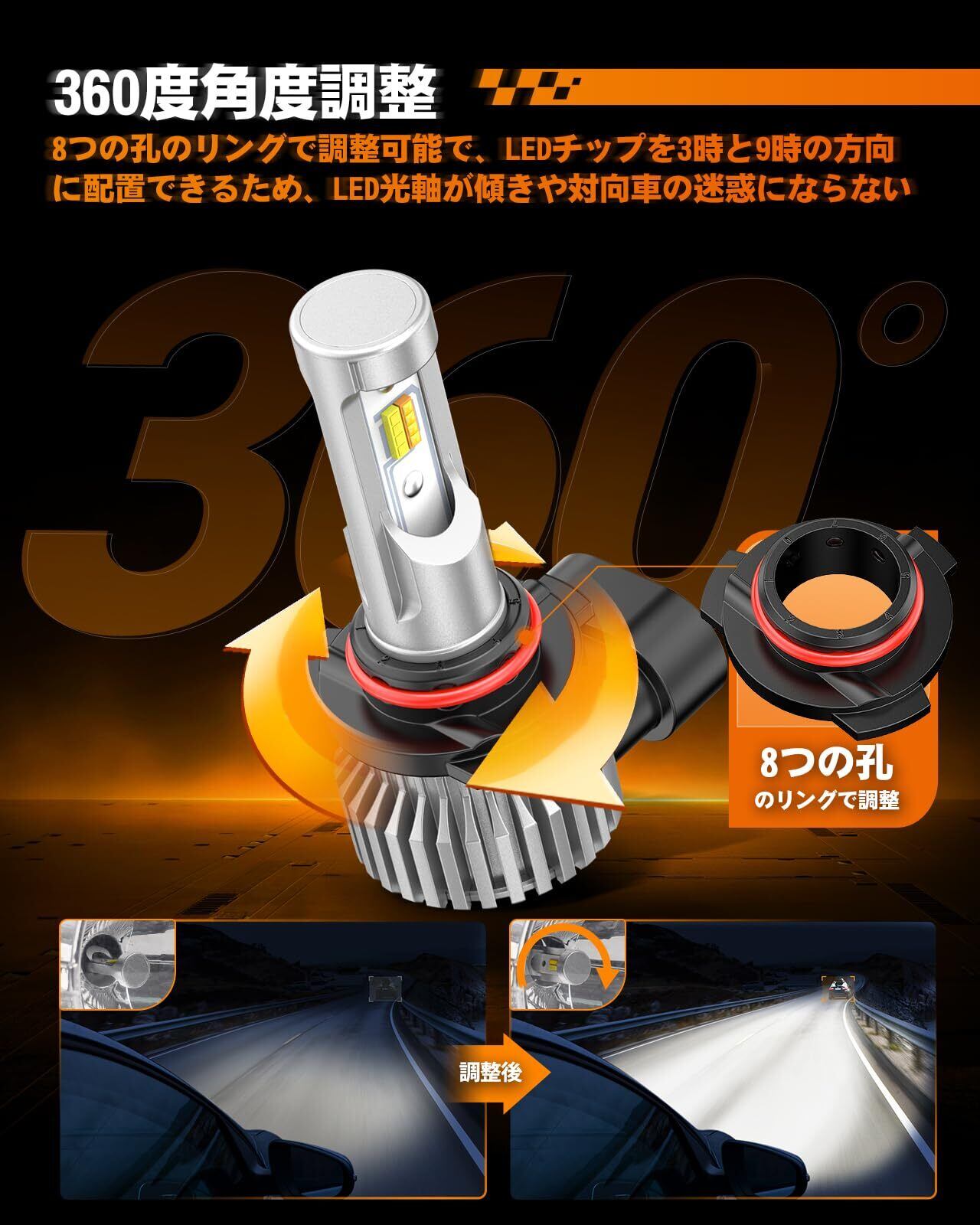 【スナップリングのアップグレード360度角度調整機能搭載】: 8つの孔を持つリングにより、LEDチップを自由に調整できます。これにより、LED光軸を3時と9時の方向に調節することが可能で、照射角度を細かく調整できます。この特長により、光の配光が最適化され、対向車の迷惑にならない。