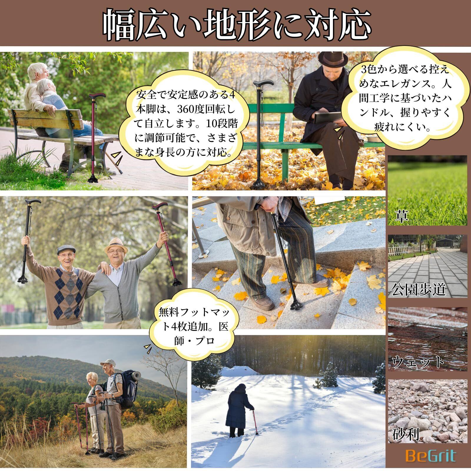 BeGrit伸縮ステッキ 杖 4本足 自立式 4点杖 軽量 多機能ステッキつえ 杖 男性用と女性用 アルミ 歩行補助杖 ステッキ 杖 10段階調節 身長142~188cmが似合います 敬老の日プレゼント