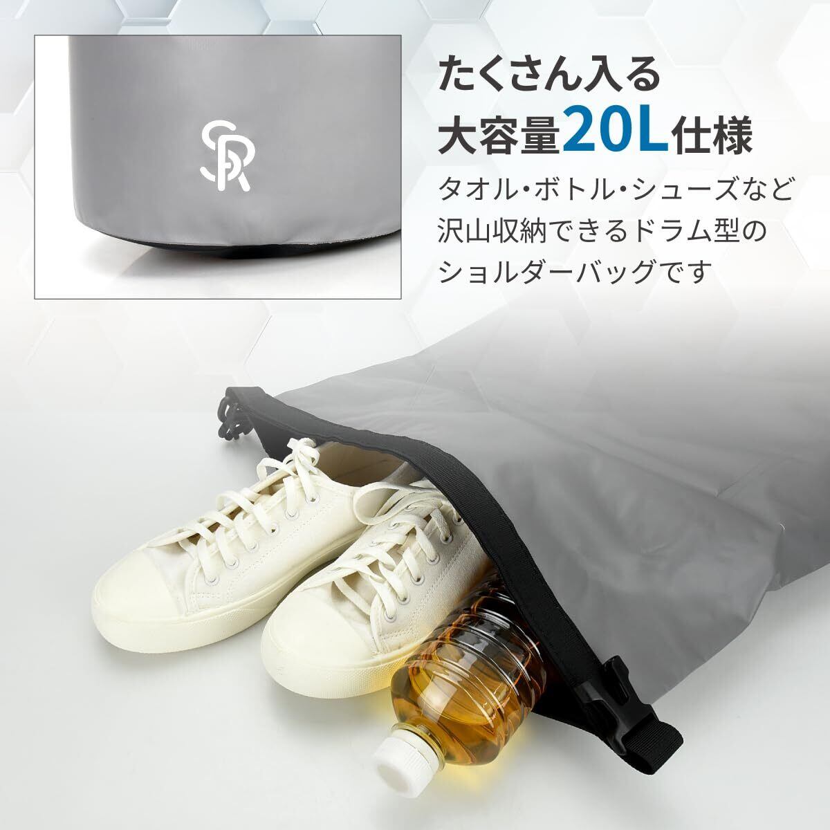 【たくさん入る『大容量』20L仕様】タオル・ボトル・シューズなど沢山収納できるドラム型のショルダーバッグです。優れた防水性により着替えやタオルはもちろん、貴重品などの荷物を水から守るスタッフバッグです。プール・海水浴・川遊び・釣りなどのアウトドアシーンに重宝することも間違いなし!見た目以上に収納力があり、荷物をバラバラに持ち歩かずに済みます。バッグの外側にもメッシュポケットが付いており、頻繁に出し入れするスマホやICカード入れにおすすめです。