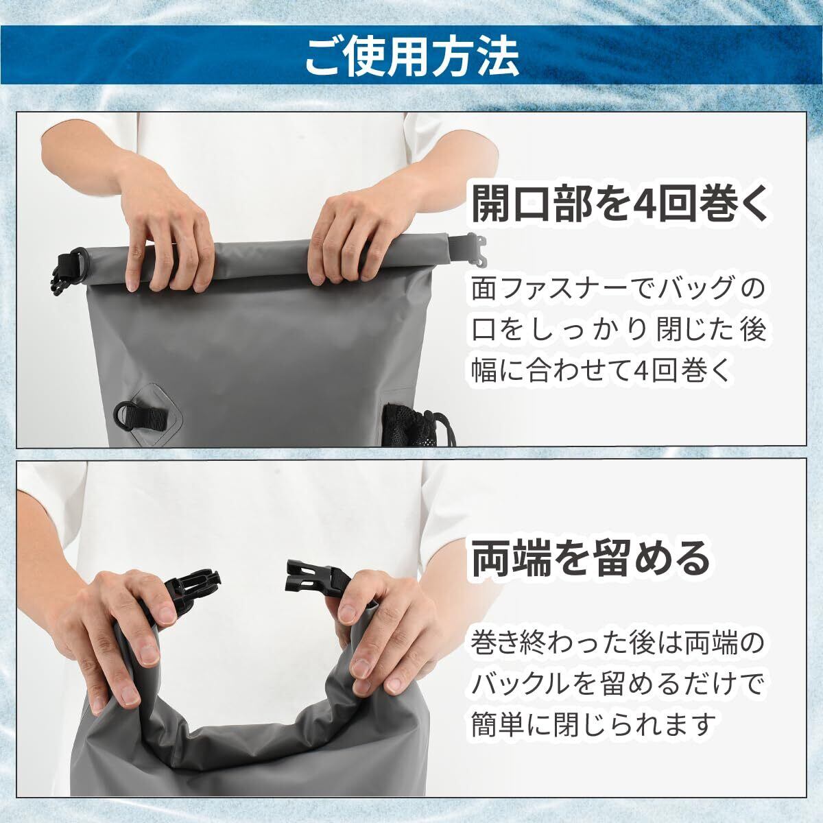 【ご使用方法】1.『開口部を4回巻く』面ファスナーでバッグの口をしっかり閉じた後、幅に合わせて4回巻く。 2.『両端を留める』巻き終わった後じゃ両端のバックルを留めるだけで簡単に閉じられます。 【セット内容】スタッフバッグ×1点 ショルダーベルト×1点 【容量(約)】20L 【サイズ(約)】バッグ:38cm×24cm ストラップ:55~105cm 【カラー】ブラック・グレー ※お好みのカラーをお選びください。