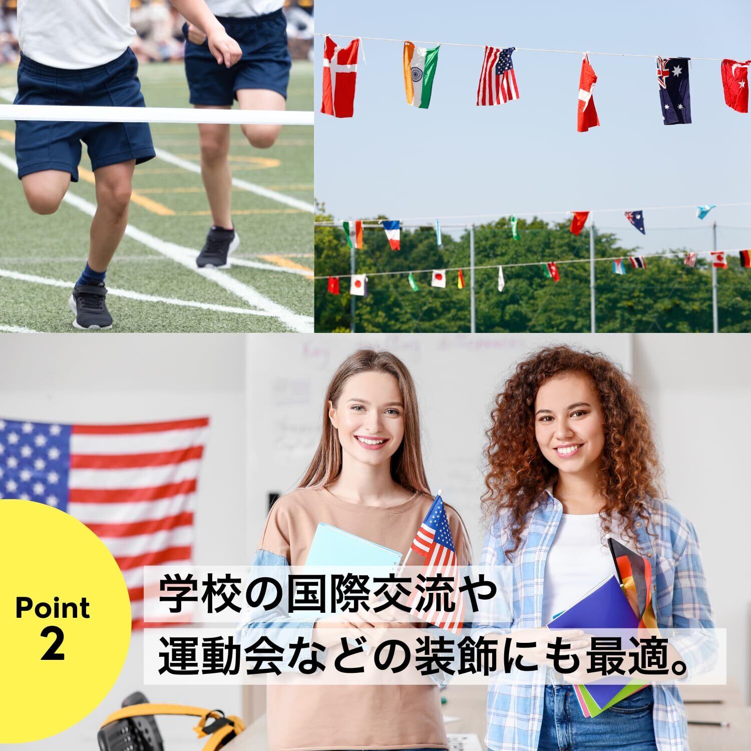 【幅広いシーンで大活躍】学校の文化祭や運動会、国際交流イベントで各国の文化を紹介するのにも最適なアイテム。そのほかスポーツなどの国際試合や行事の応援にもお使いいただけます。