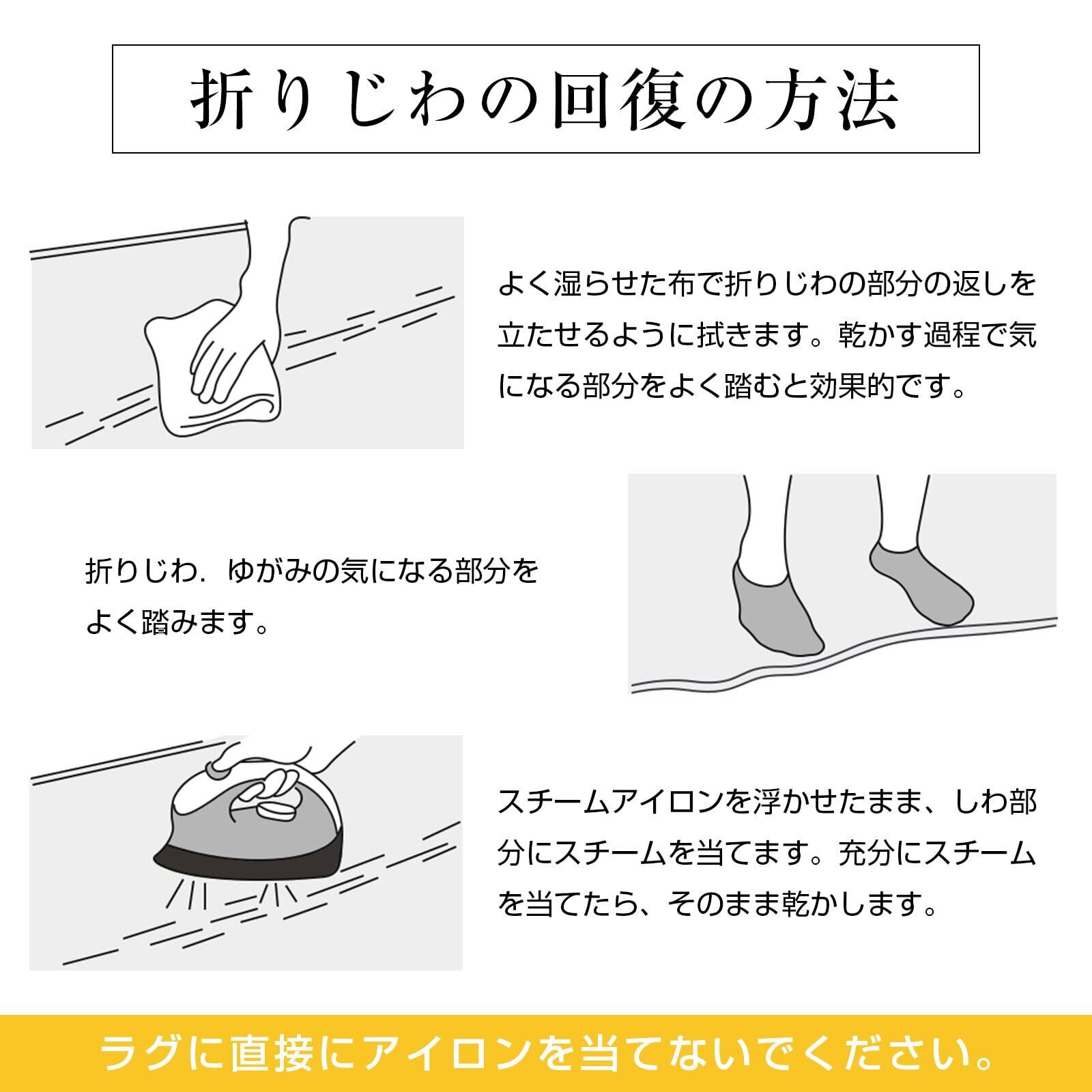 【滑り止め・抗菌・防ダニ加工】衛生的にお使いいただけるよう、抗菌・防臭・防ダニ加工を施しています。ラグの裏面にはゴム製の滑り止め加工を施し、フローリングに敷いても滑りにくく安心です。また、ノンホルム仕様なので、お年寄りやお子様、ペットがいるご家庭でも安全にお使いいただけます。