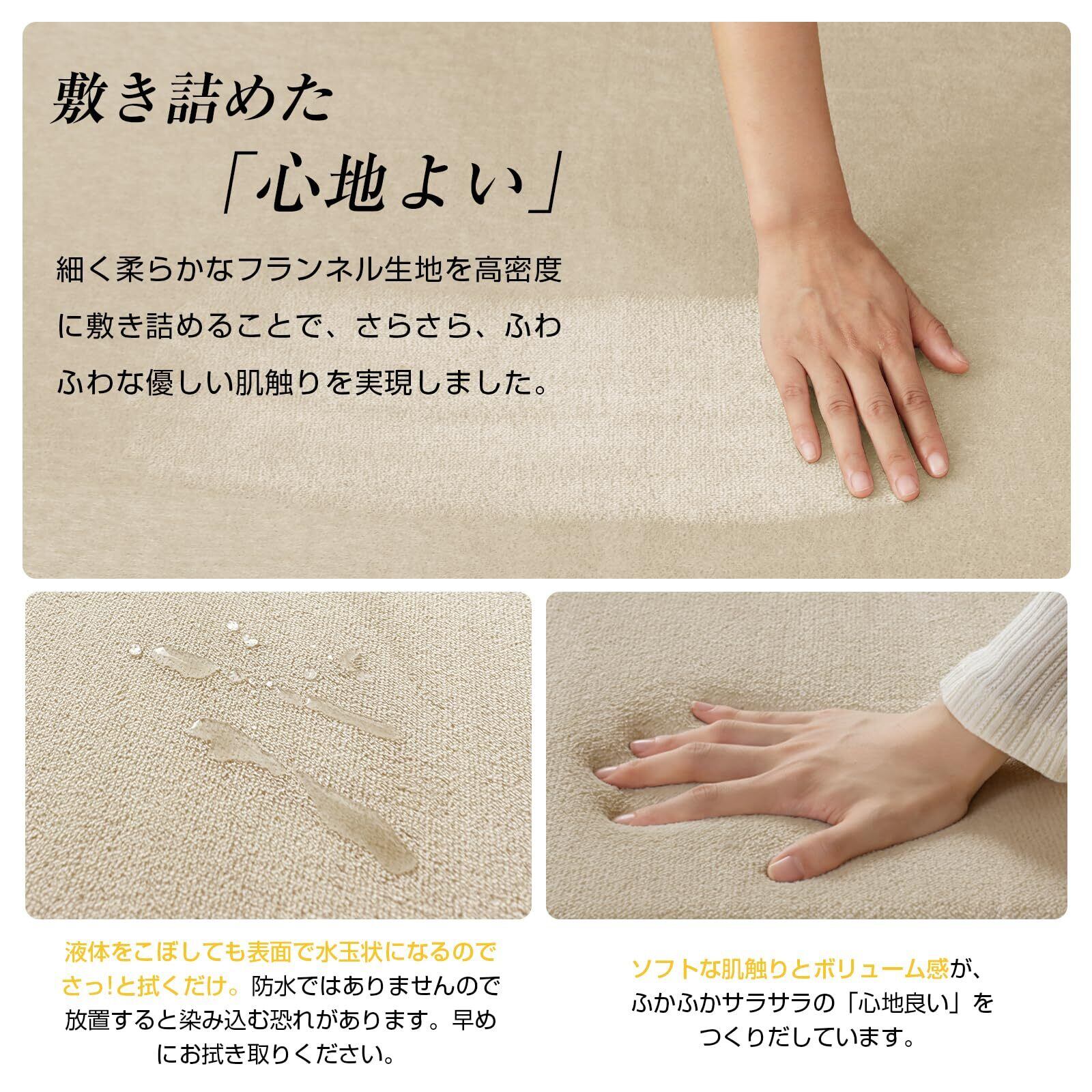 【オールシーズン対応】絨毯表面は、細く柔らかなフランネル生地を高密度に敷き詰めることで、さらさらとしたふわふわの肌触りを実現します。極細マイクロファイバーを使用しているため、軽量で保温性・速乾性に優れており、夏はサラッと、冬はあたたかくお使いいただけます。床暖房やホットカーペットにも対応し、底冷えする季節でも足元をぽかぽかと温かく保ちます。