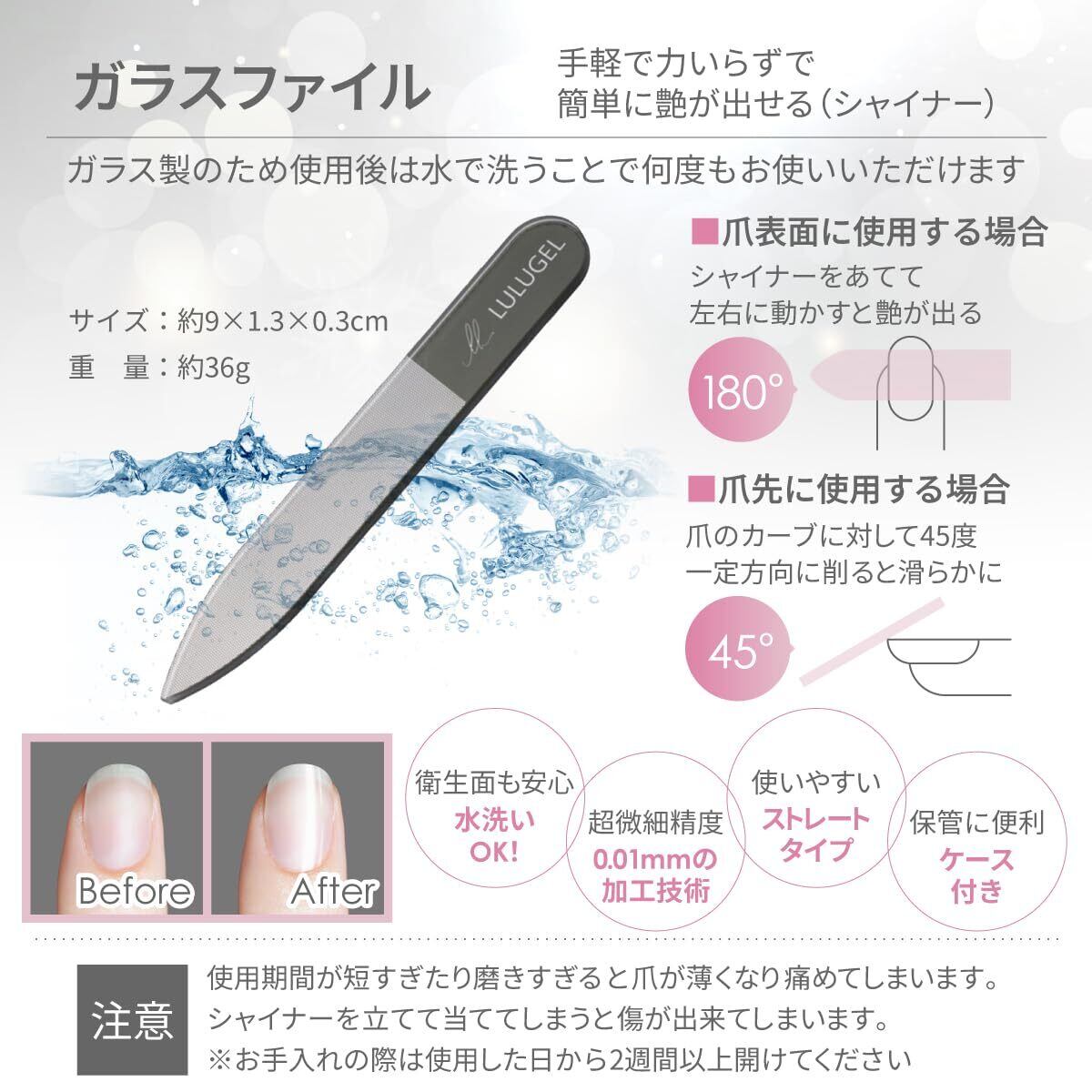 【ガラスやすり】ネイル用品でネイルシャイナーとよばれており。グリット数はナノレベルなのが特徴です。爪磨き ガラス製で自爪ケアをするメンズも急増していてジェルネイルをしない人にも人気の商品です。ガラス 爪やすりを使うときは斜めがけしないようにご注意下さい。ネイル ヤスリ、爪 手入れ、ネイル ケアと言えばLULUGELをよろしくお願いいたします。