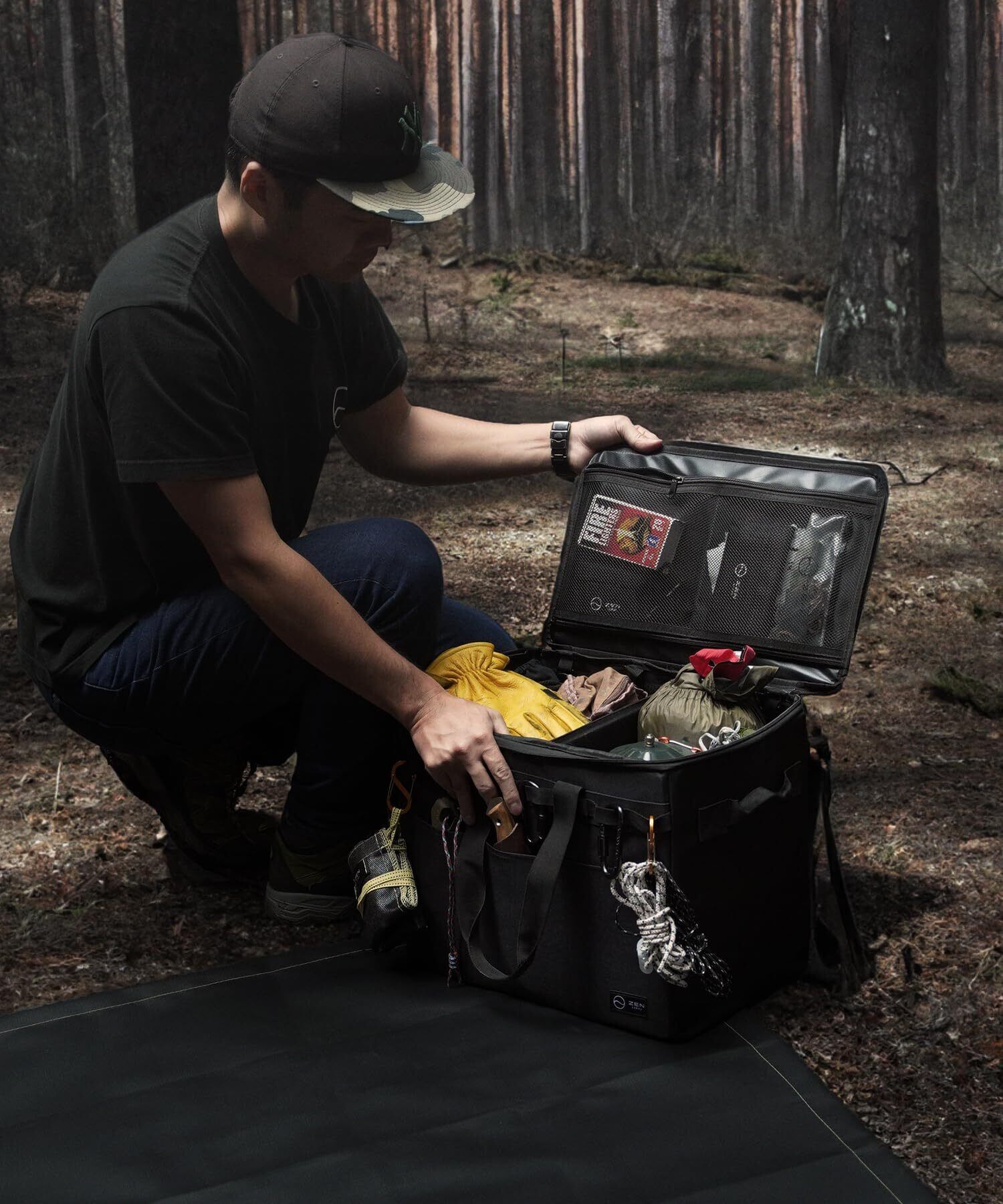 ソフトコンテナのカラビナループを活用することでガイロープを吊るすなどさらに多くのギアをコンテナで持ち運ぶことが可能です。