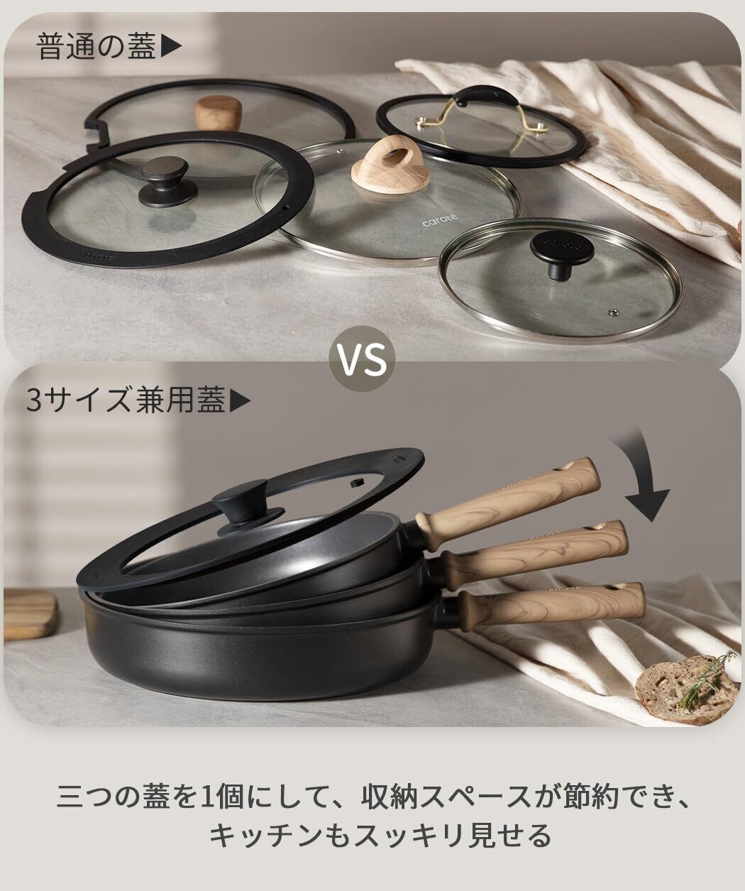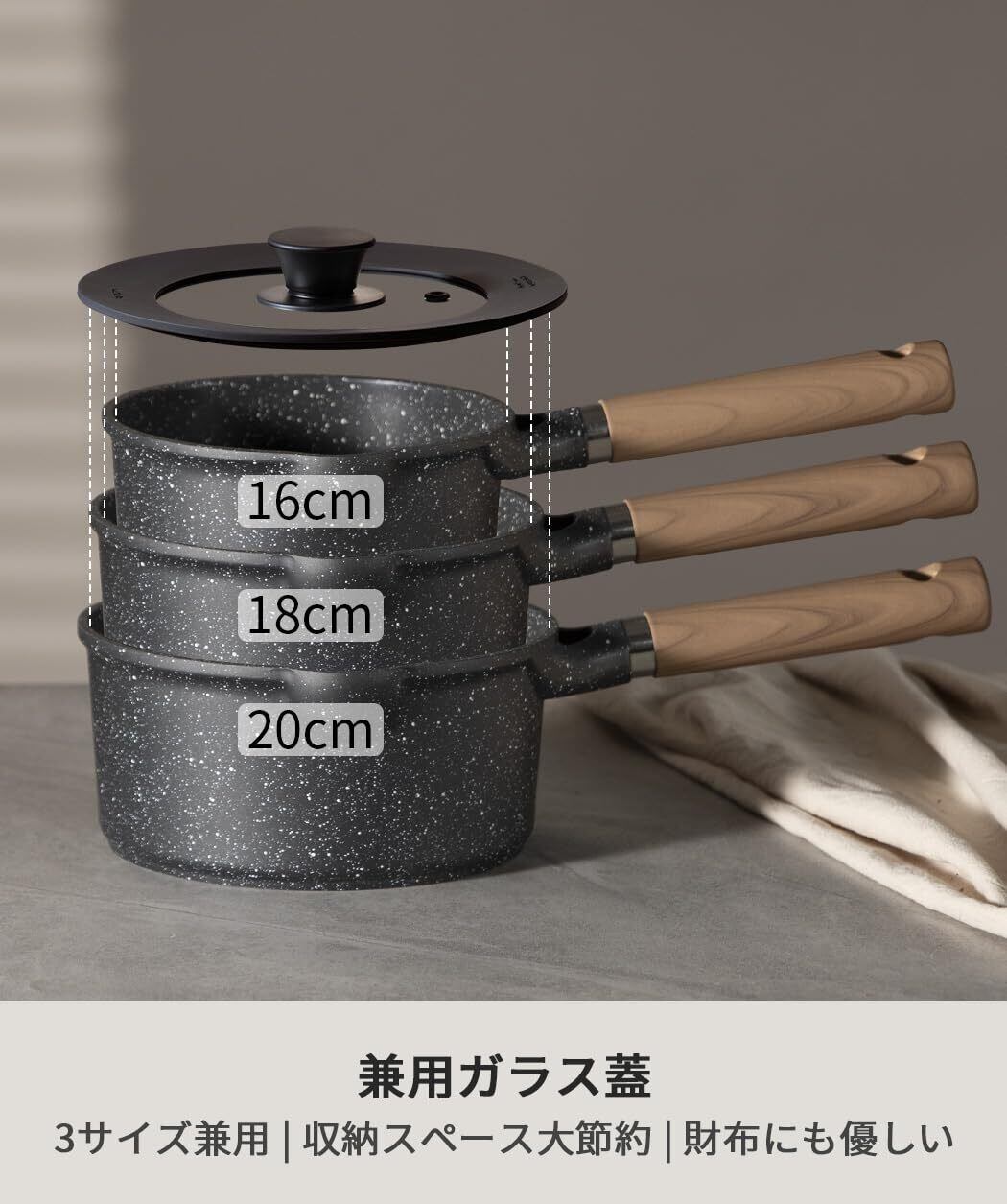 【16cm 18cm 20cm兼用】三つのサイズ兼用で、16cm&18cm&20cmフライパンとか深型フライパンでもこれ一つで十分!食洗器も対応なので、お手入れは楽々!