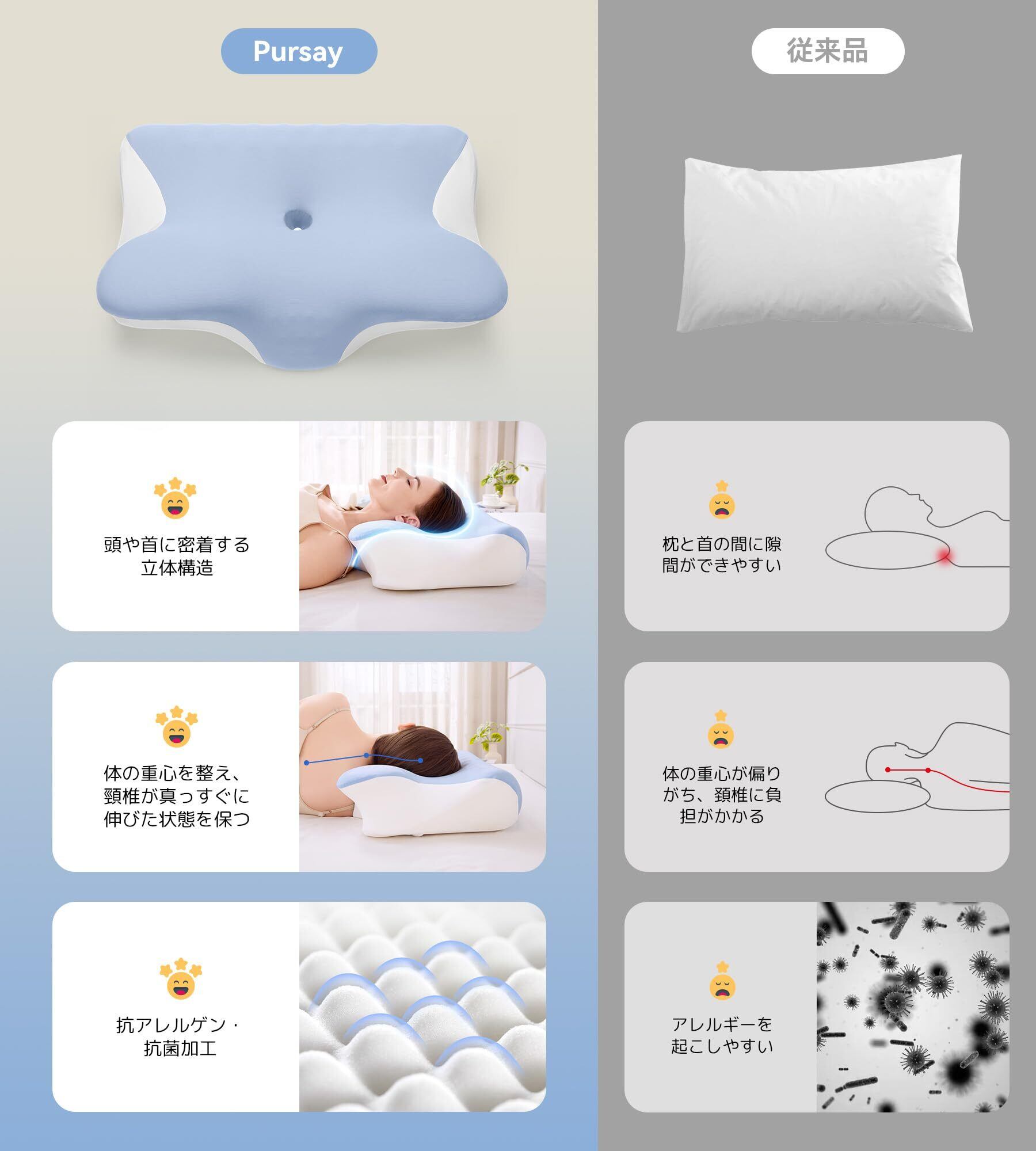 【快適な眠りためのプレゼント】睡眠不足は、精神的な疲労や免疫力の低下を引き起こす原因にもなる。快適な睡眠が取れないご両親、旦那様や彼氏様、家事で肩の負担が気になる奥様、大切な人にPursay安眠枕で快適な睡眠を!誕生日や記念日、父の日/母の日/敬老の日/クリスマス/お引っ越し/ご入学/ご就職/お歳暮など、さまざまな祝事の際の贈り物におすすめ。