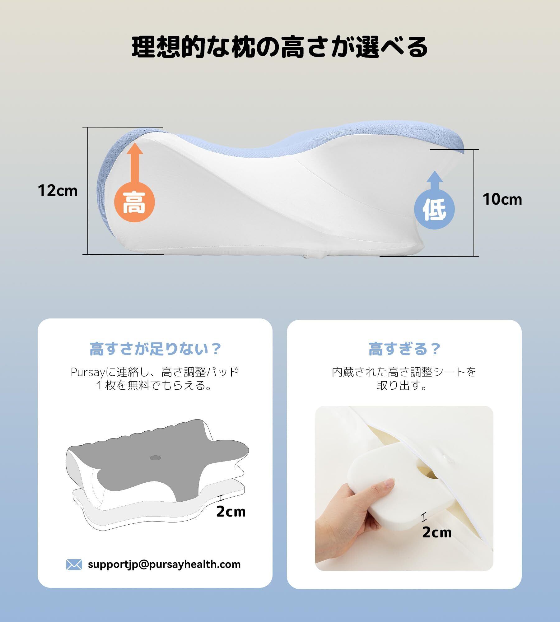【お好みの高さが選べる】人によって快適な高さは違います。Pursay快眠枕の前後を変えることにより、10cmと12cmが選べます。厚さ2cmほどの高さ調整シートが1枚内蔵され、取り出せば、さらに低くすることができる。高い側でも十分な高さと感じない場合は、Pursayサポートまでご連絡、高さ調整パット1枚を無料でもらえ、まくら全体の高さを2cmほど高くすることができます。お客様は自分の体格によって、低めの枕と高めの枕を自由に調整でき、理想の高さで心地よく眠れる。