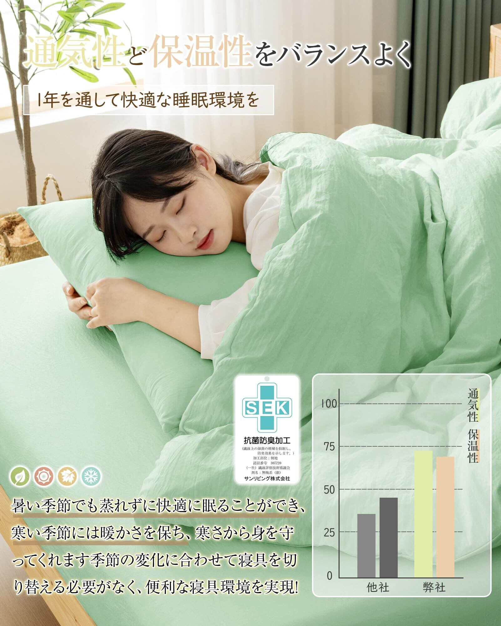 【オールシーズン&和洋通用の仕様】通気性と吸放湿性優れて、夏の場合は、就寝中にかいた汗を吸い取ったり、発散してくれるのでいつでもサラサラとした肌触り。冬の時、カバーの繊維と繊維の間に暖かな空気をためてくれるので、布団の中を暖かく保ったりするという役割もあります。オールシーズン快適な寝心地が楽しめます。和洋どんなテイストのお部屋にも馴染みやすい。自家用でも、ご両親、友人にプレゼントとしてもおすすめします。洗い替え用、来客用としては最高です。