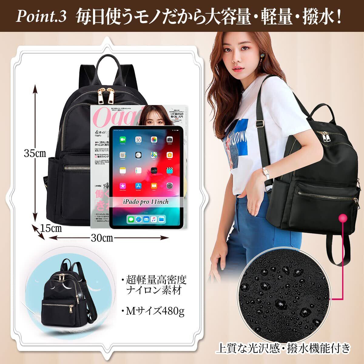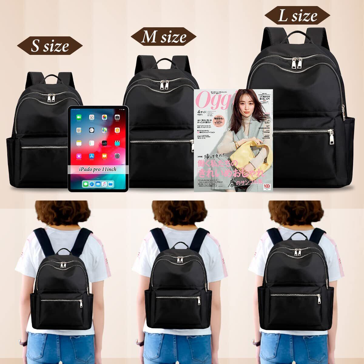 【見た目以上の便利な収納力】ポケットが多いから収納力がたっぷり(S/Lサイズは9ポケット、Mサイズは11ポケット)。メインポケットと小物用ポケットがバランスよく配置されているから、iPAD、折畳み傘、財布、化粧品、鍵などの小さなアイテムもしっかり整理整頓することができます。リュックの内側が黒地ではないので、中身が見やすく取出しやすいのもポイントです。スマホや貴重品を入れるのにおススメの背面ポケットはほどよい大きさで便利です。毎日持ち歩くバッグとして、旅行用のバッグとして幅広く機能的にご使用いただけます。