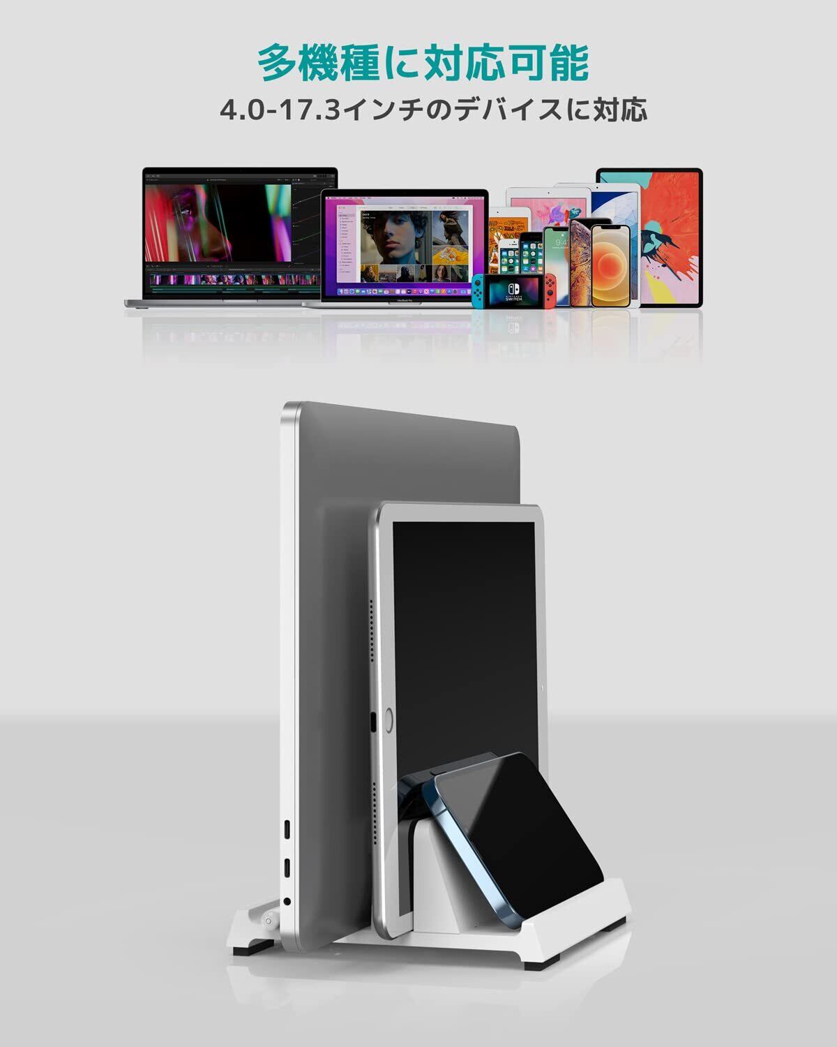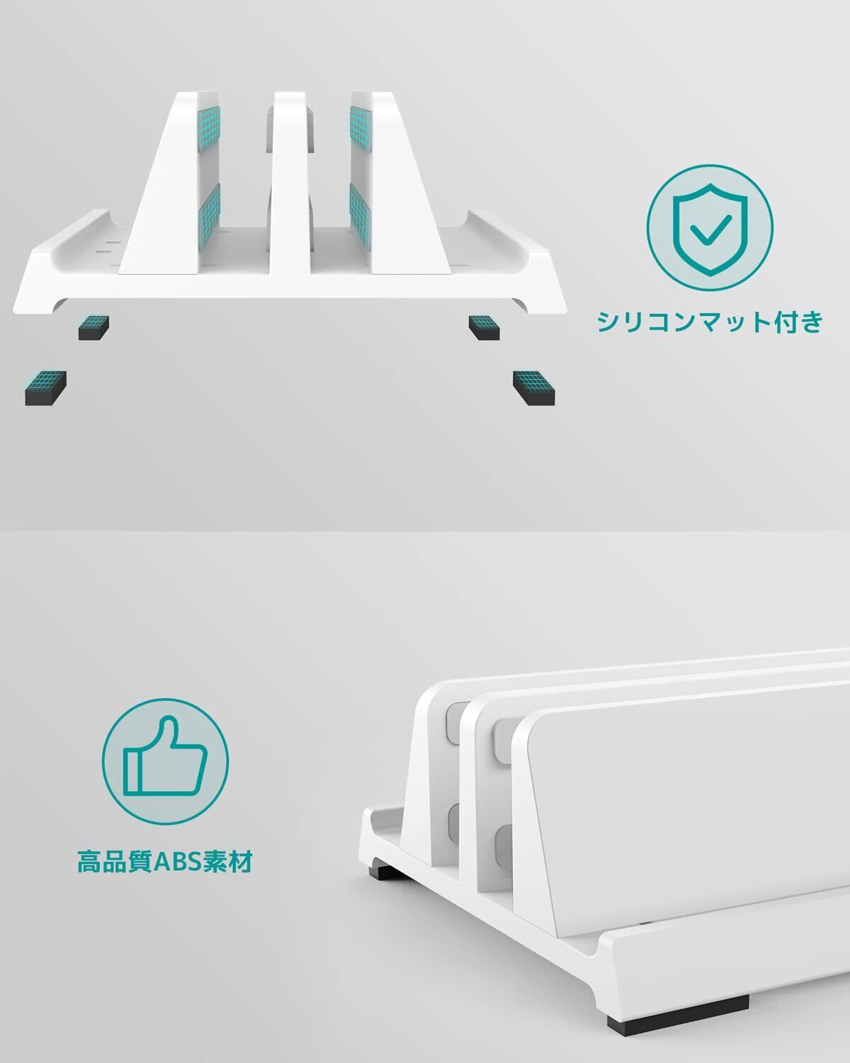 【重量感と滑り止めデザイン】高品質ABS素材を採用し、スタンド本体に重さがあって、最大17.3インチのデバイスに対応可能です。台座の底部やスロットの内側には滑り止めのソフトパッドが貼られており、机やノートパソコン本体への傷を防止します。