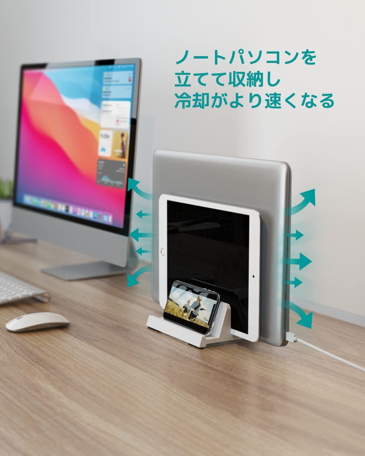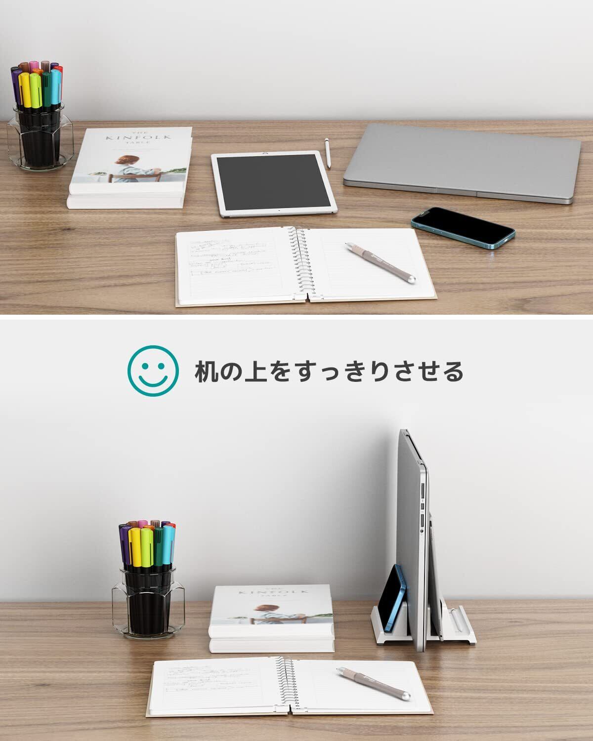 【熱放散&充電】平置きで熱がこもってしまい、操作性に影響を与えることを避けるために、縦置きスタンドにノートパソコンを立てかけて、熱を速く放散させます。また、デバイスを立てて収納しながら充電することも割と行いやすいです。