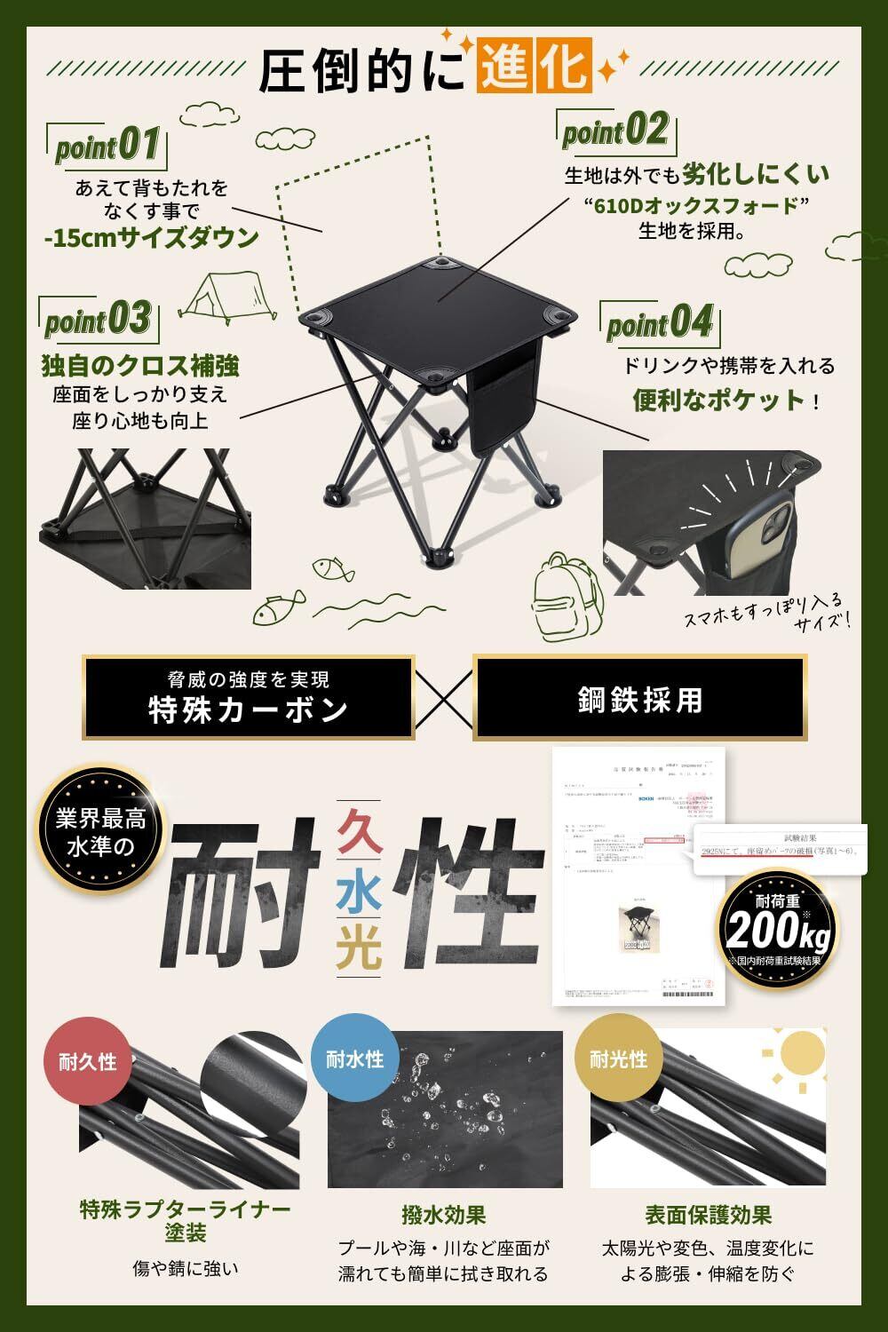 【既存商品を大幅改善!業界最高水準の耐久性】脚部のパイプはラプターライナー塗装という特殊塗装を行うことで、表面の保護をより強力に行い、耐久性・耐水性・耐光性を大幅に向上しております。また座面には610Dオックスフォード生地を採用し、撥水性・耐摩擦性・通気性を向上し、より長く安心してお使いいただけます。座面裏側にはクロスで補強を追加し、座った際に沈み込みづらく、より強靭な座面へと進化させました。この軽さとコンパクトさで国内認定試験で耐荷重は驚きの200kg!大人の膝の上に子供が乗っても安心してご使用いただけます。
