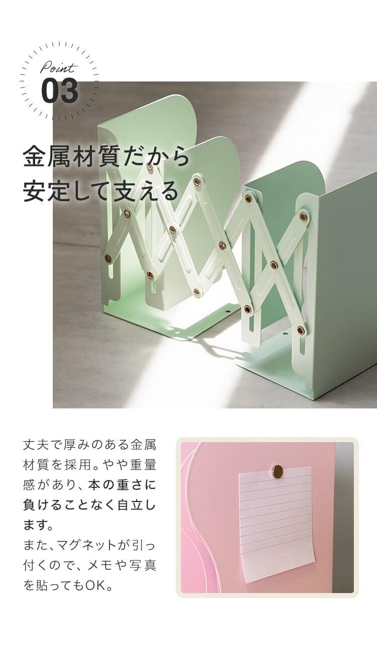 【耐久性優れた金属製】丈夫で厚みのある金属素材を採用、本の重さに負けることがなくしっかり自立します。また、マグネットが引っ付くのでメモや写真を貼ることもできます。バッククロス設計ですので本が後方に落ちにくく、いろんな場所でお使いいただけます。