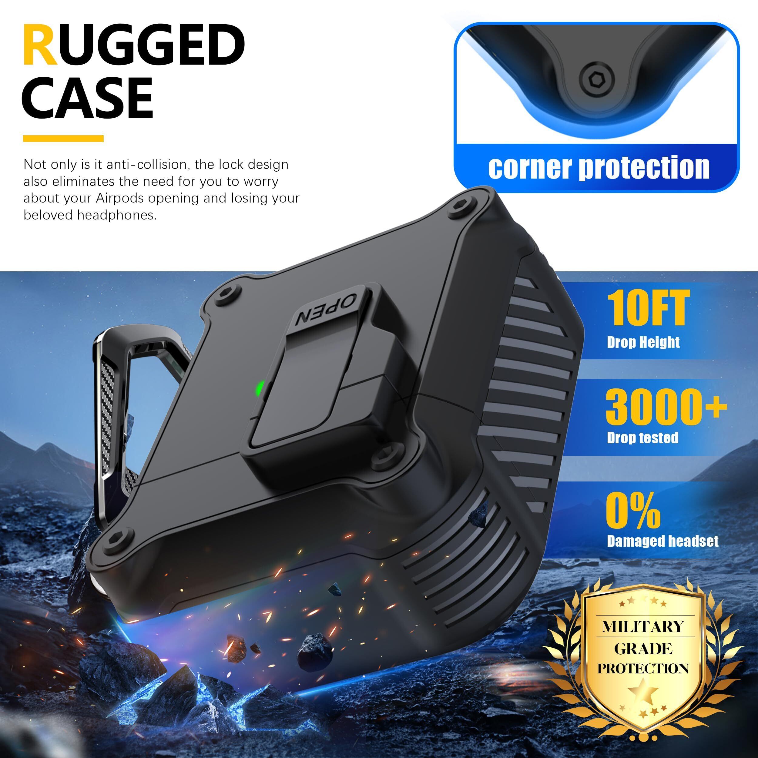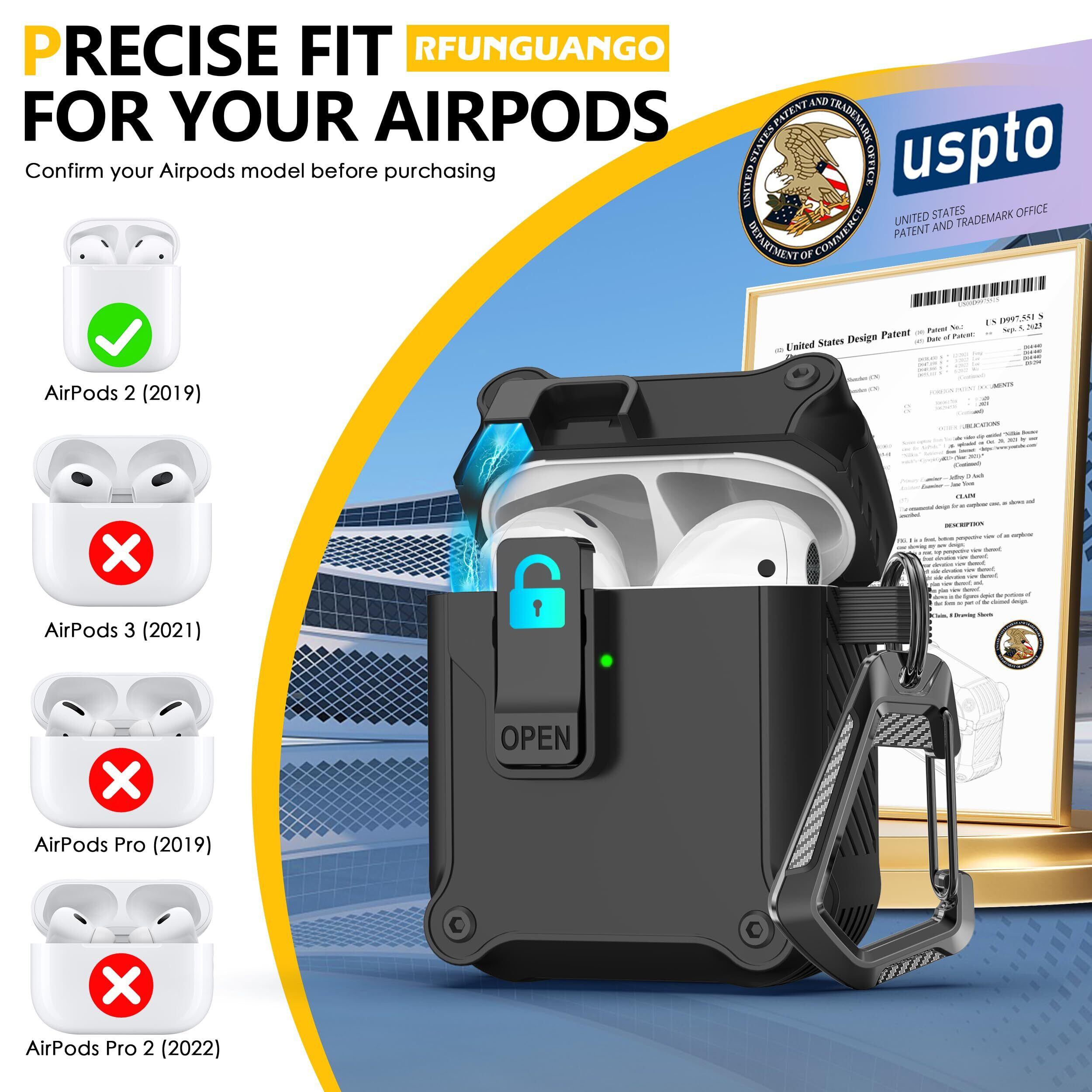 RFUNGUANGO Airpods 第 2 世代および第 1 世代保護ケース 安全ロッククリップ付き自動ポップアップ、キーチェーン付きフルボディ耐衝撃ハードケース (無料クリーニングツール) - ブラック | hananoki