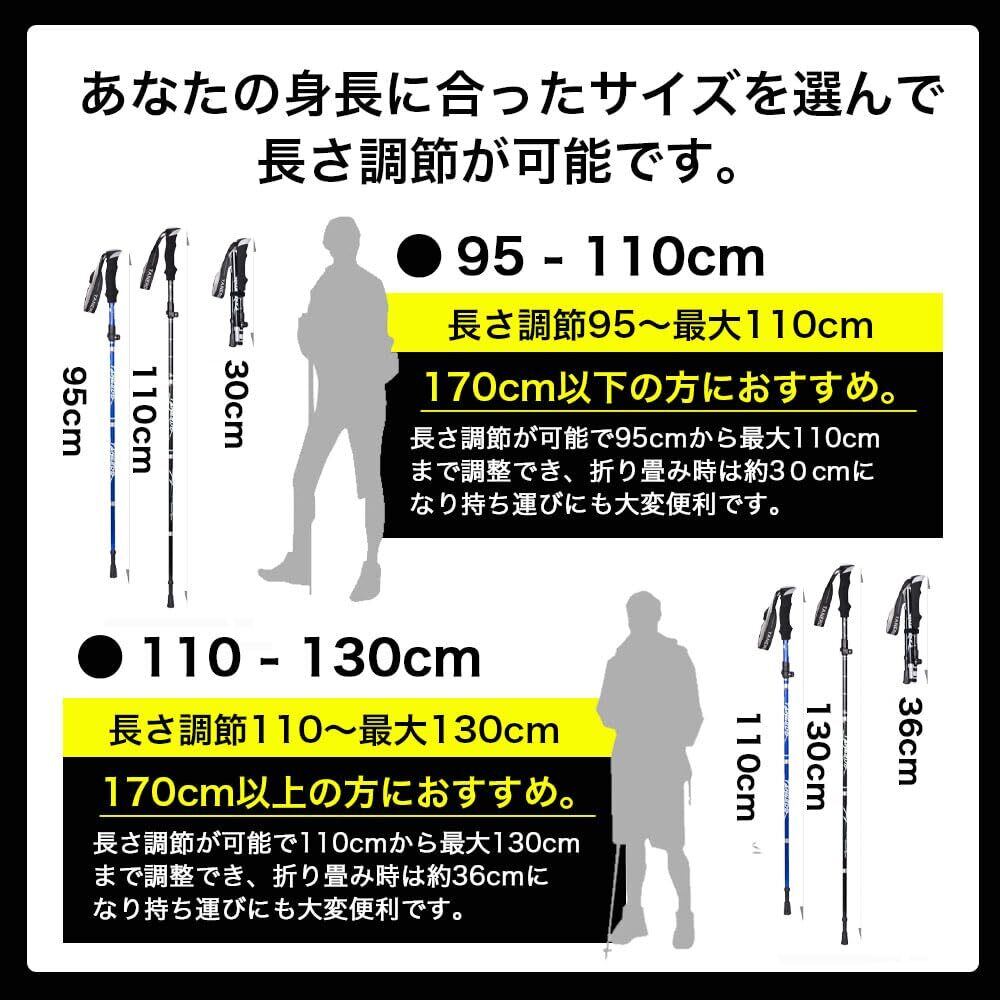 【こんな商品をお探しの方におすすめ】トレッキング、登山、ウォーキングや神社参りの際に膝への負担を軽減したい!勾配のある坂道や山登りの際に、 トレッキングポール や ウォーキングポール を使って負担を軽減したい方はおすすめです!サイズは2種類。95cm-110cmと110cm-130cmで選べます。重量はどちらもわずか250g〜290gと超軽量のトレッキングポールをお探しの方にもお勧め!折りたためるトレッキングポールで2本セットをお探しの方、初心者でも簡単に扱えるトレッキングポールをお探しの方はぜひお試し下さい。