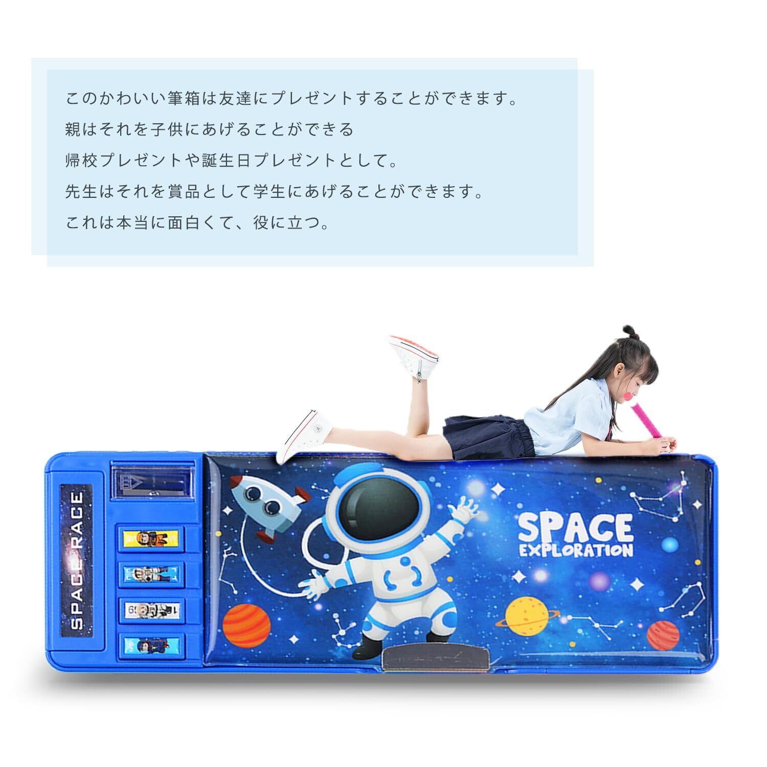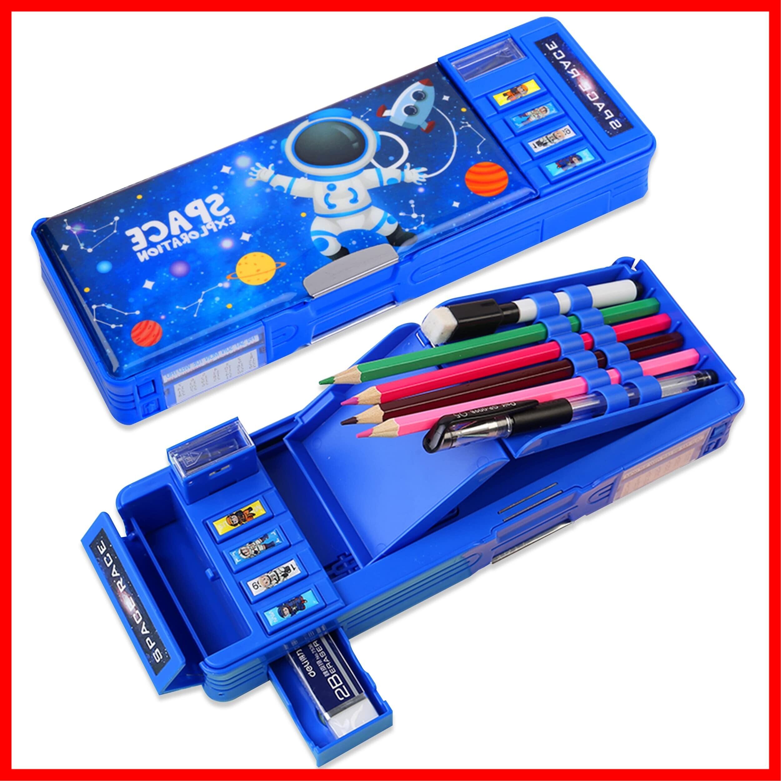 LilyBeauty ポップアップ多機能ペンシルケース 女の子と男の子用 かわいい漫画ペンボックス オーガナイザー 文房具 ロック/シャープナー/スケジュール ホワイトボード/学用品 子供への最高のギフト (青)