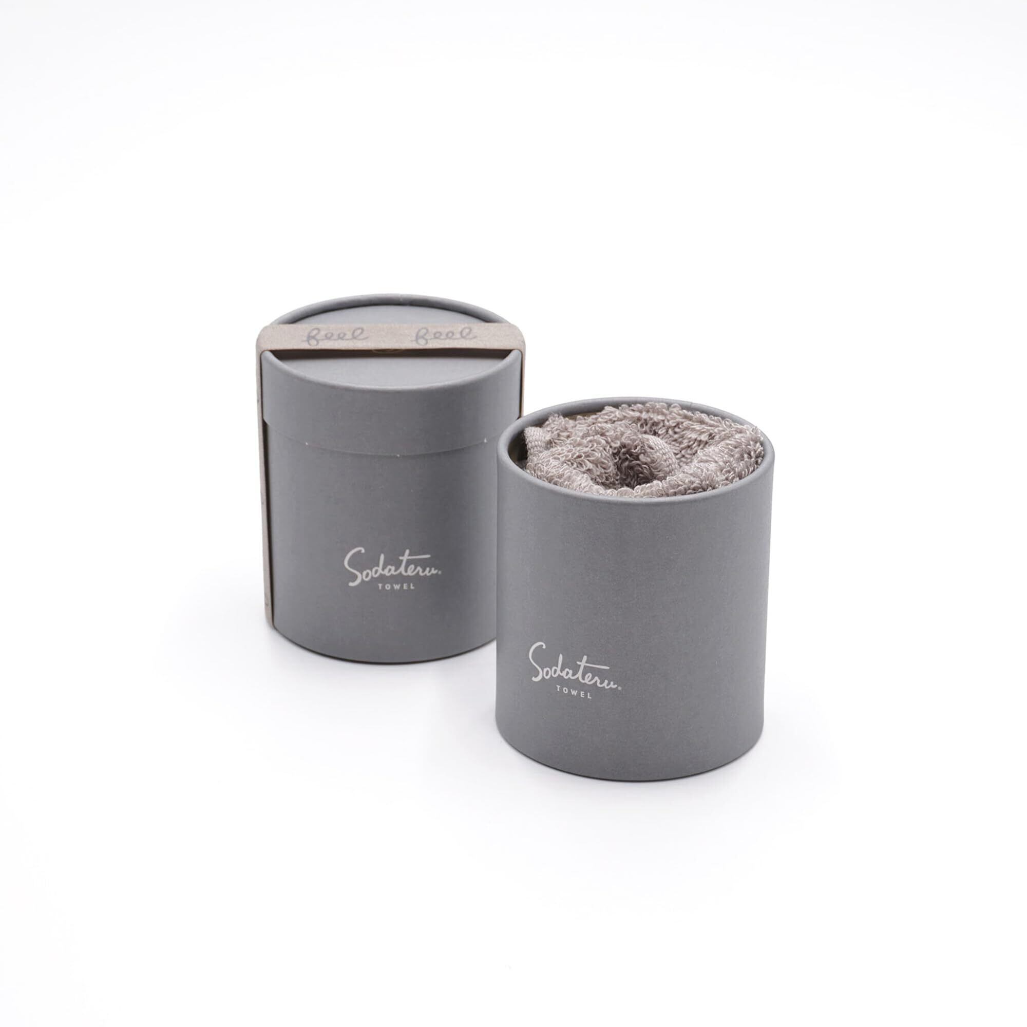 【スペック】タオルサイズ:20×20cm│ボックスサイズ:φ7.5×H8.5cm│素材:綿100%│お渡し用バッグ(別売)サイズ:SSS