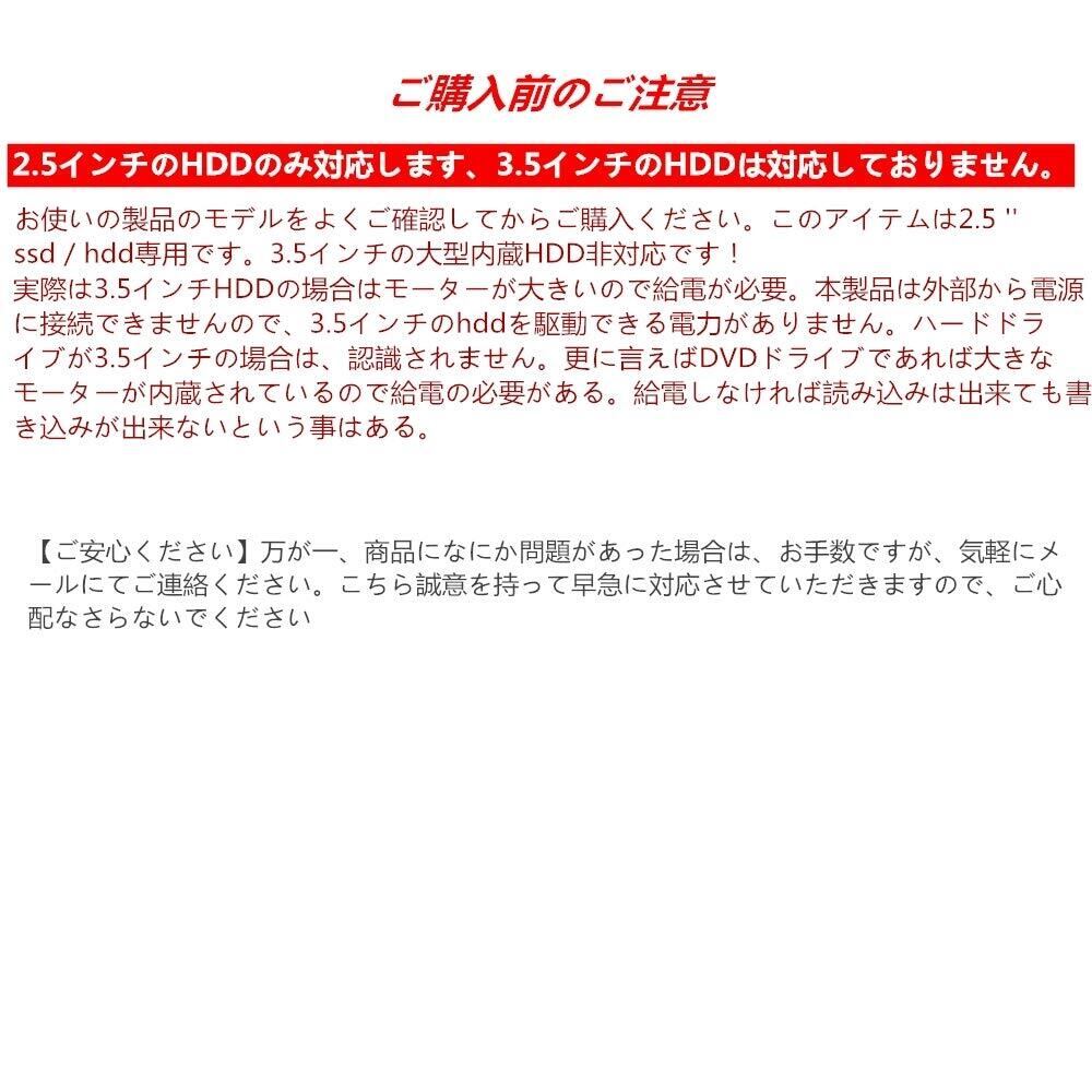 【ご注意】 2.5インチのHDDのみ対応します、3.5インチのHDDは対応しておりません。お使いの製品のモデルをよくご確認してからご購入ください。ハードドライブが3.5インチの場合は、認識されません。 商品をパソコンに接続する前に、USBインタフェースの駆動を最新バージョンにアップしてください。ハードディスクに接続する時、USB 3.0ポートに接続してください。USB 3.0の電流はアメリカb 2.0の電流の2倍です。もしUSB 2.0インターフェースに接続すると、電気が不足しているため、ハードディスク接続後に繰り返し切断して認識します。識別しない場合もあります。